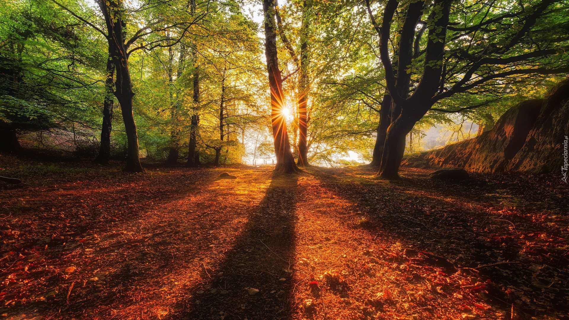 Edytor tapety: Promienie słońca w jesiennym liściastym lesie