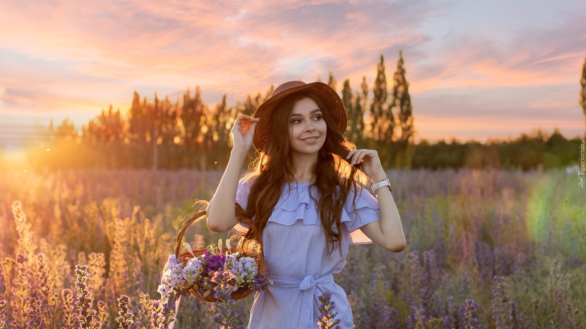 Edytor tapety: Dziewczyna z kwiatami w koszyczku w blasku słońca
