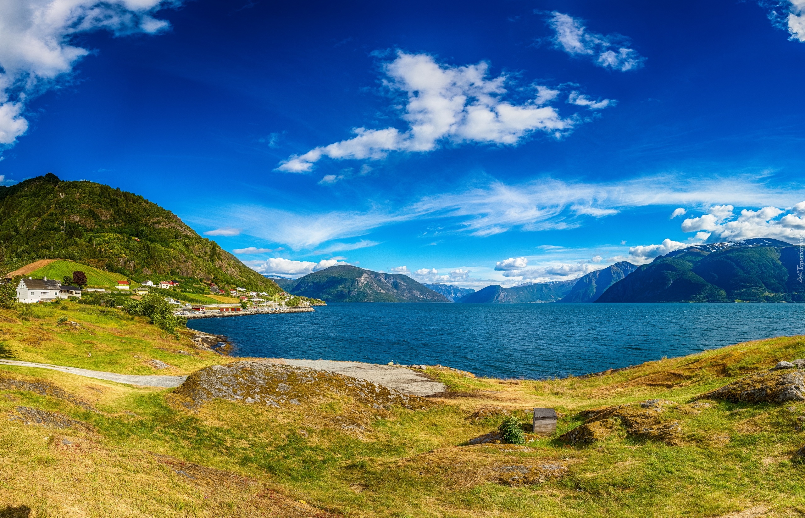 Edytor tapety: Górski krajobraz z domami nad jeziorem