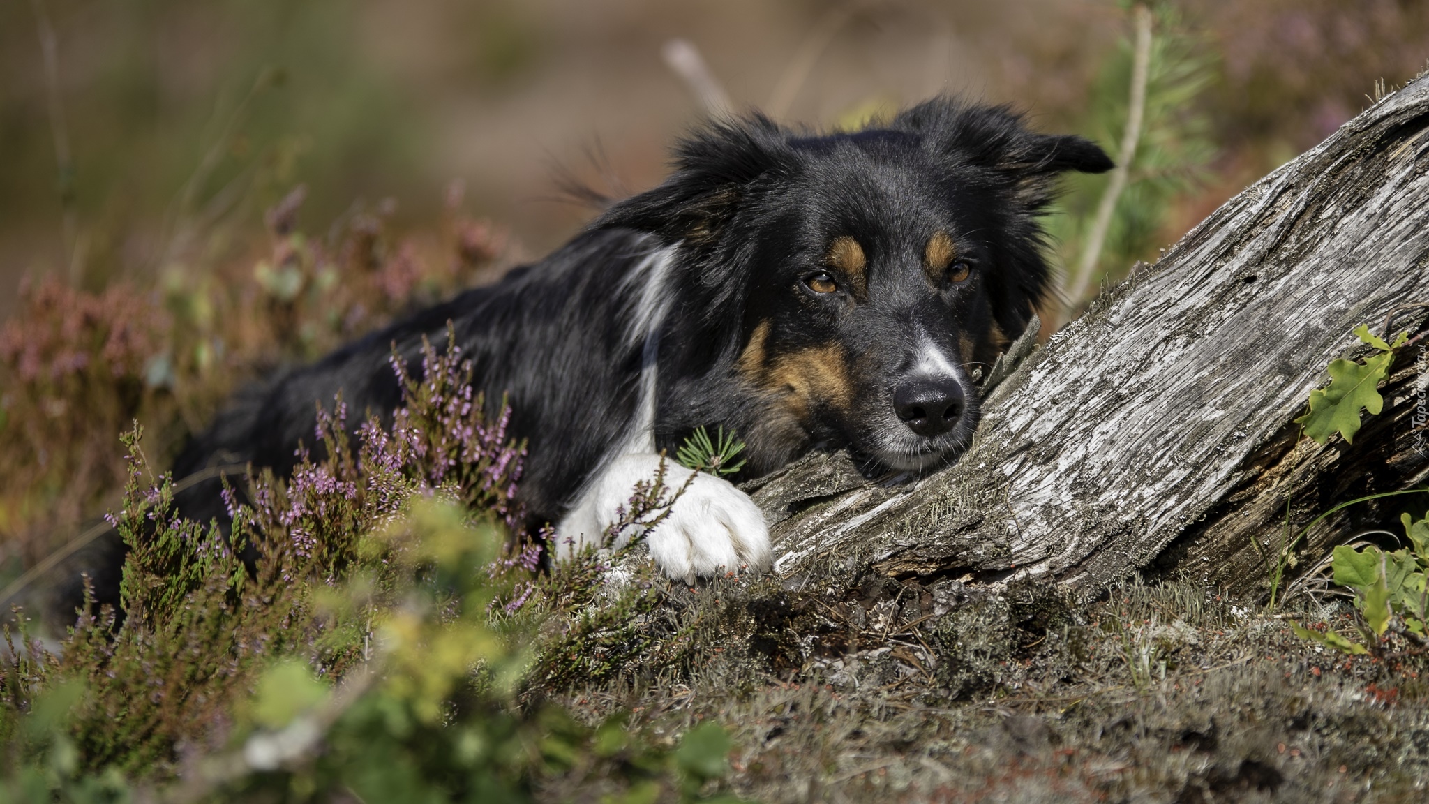 Edytor tapety: Leżący border collie na kłodzie drzewa