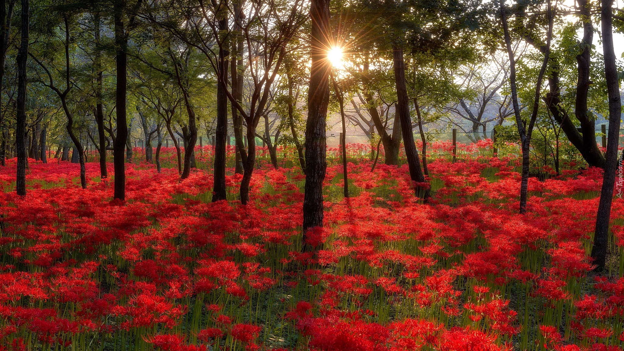 Edytor tapety: Czerwone kwiaty pośród drzew w promieniach słońca