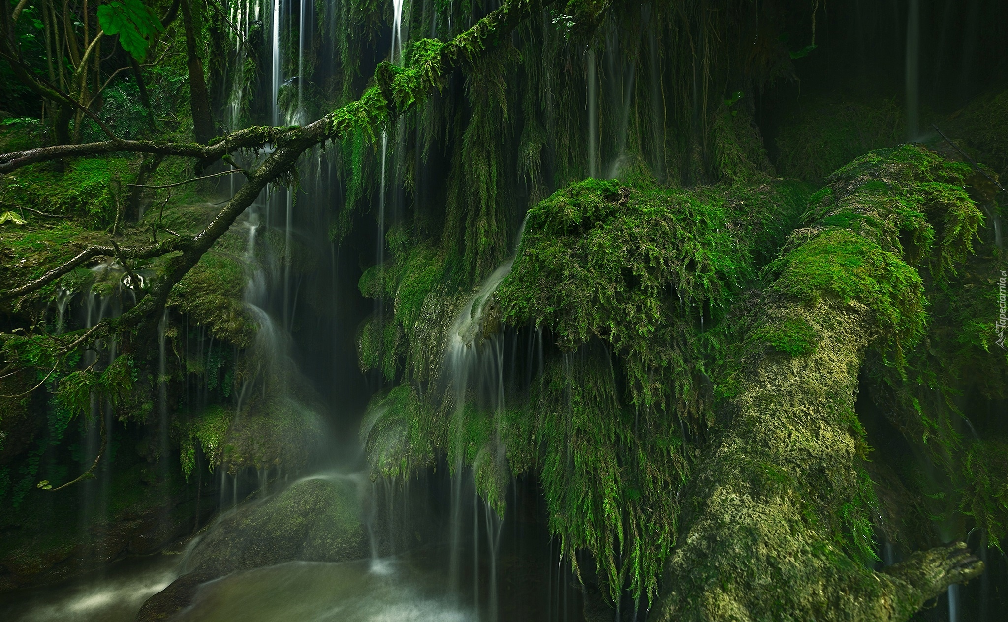 Edytor tapety: Wodospad na omszałych skałach i drzewach
