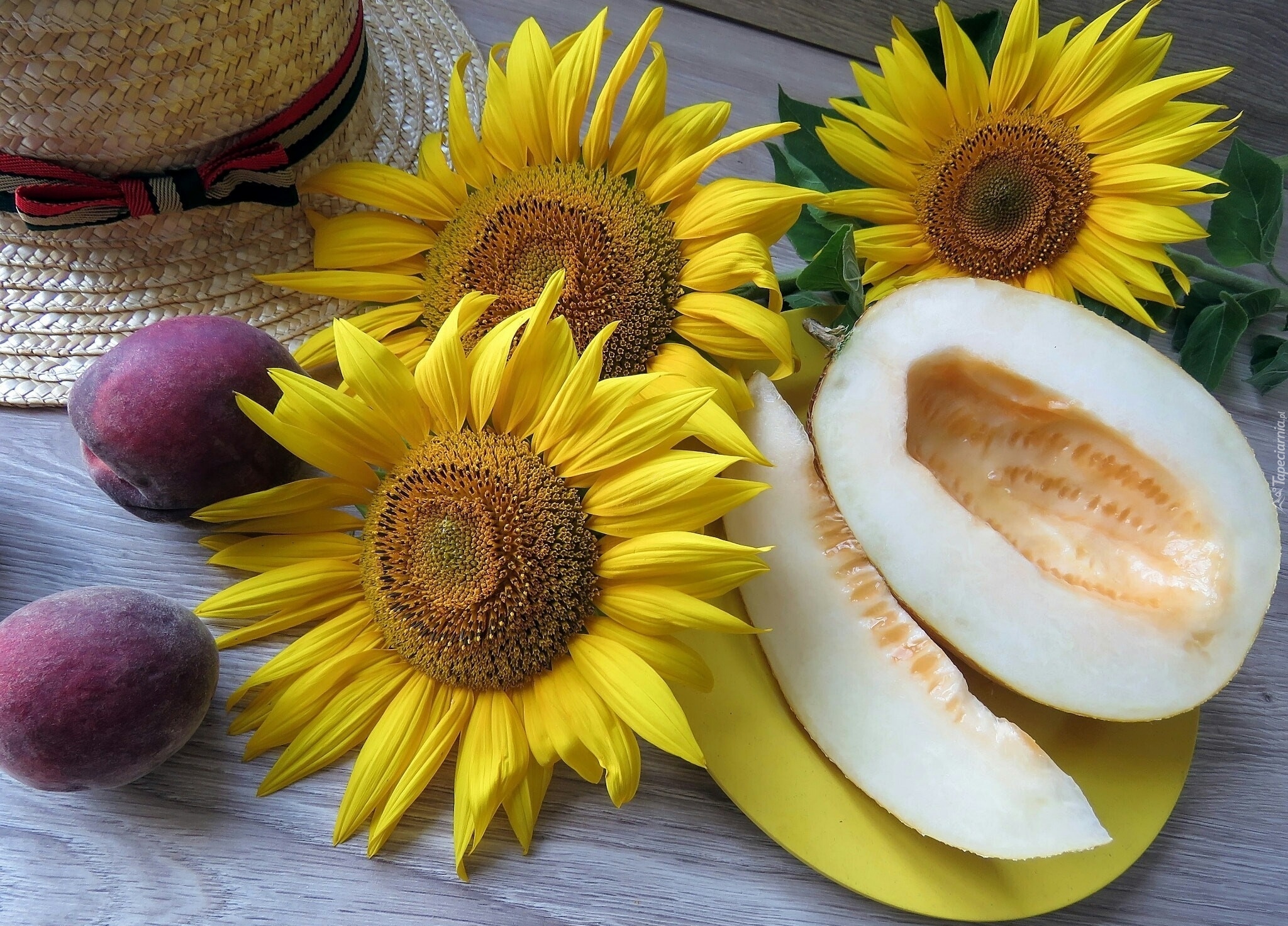 Edytor tapety: Kwiaty słonecznika obok przekrojonego melona i śliwek