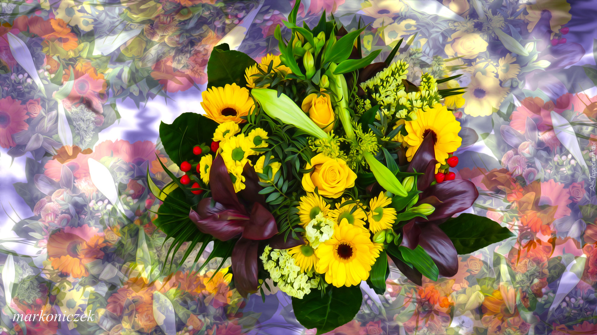Edytor tapety: Bukiet róż i gerber na kwiatowym tle