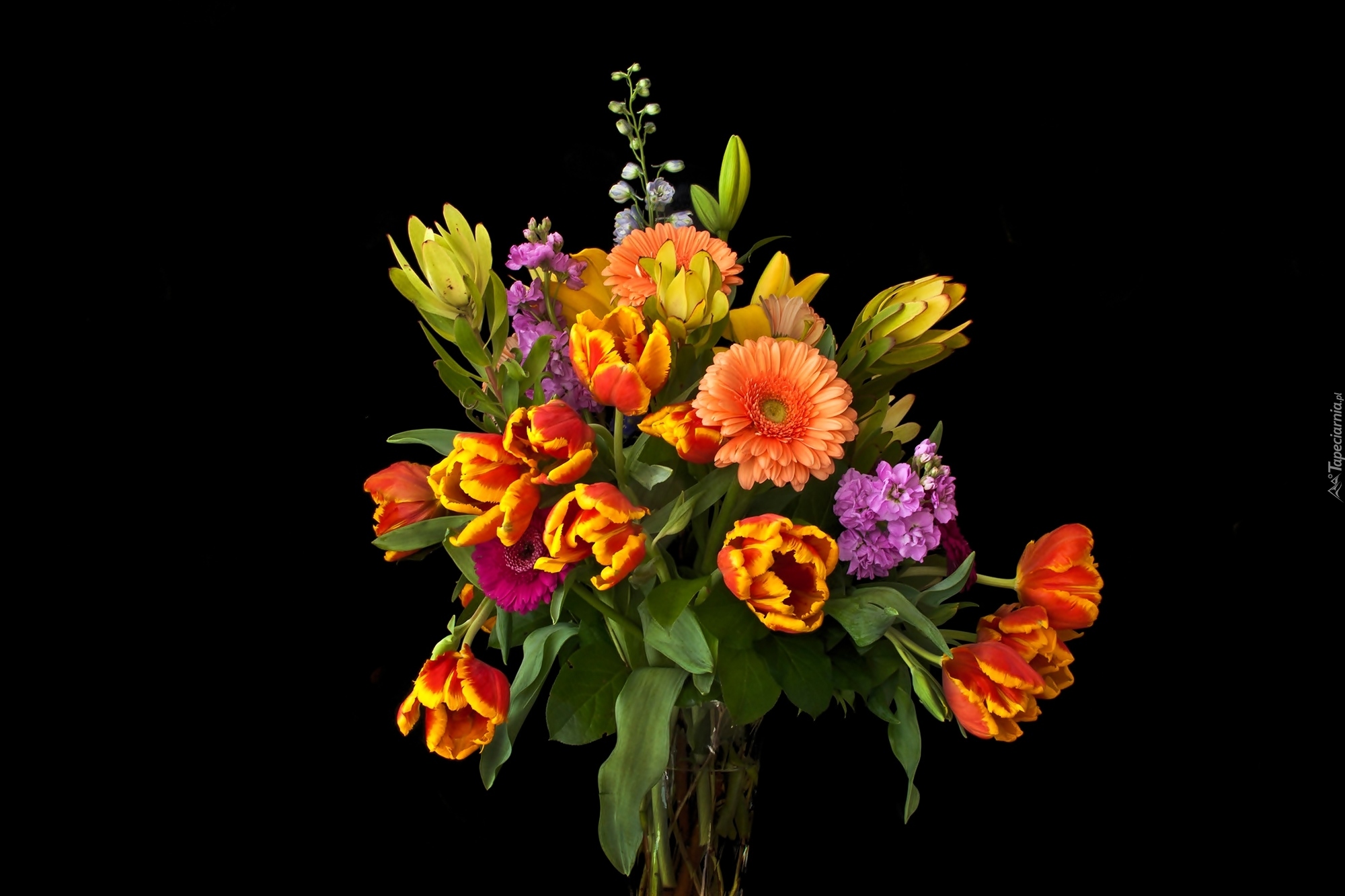 Edytor tapety: Gerbery i tulipany w wazonie