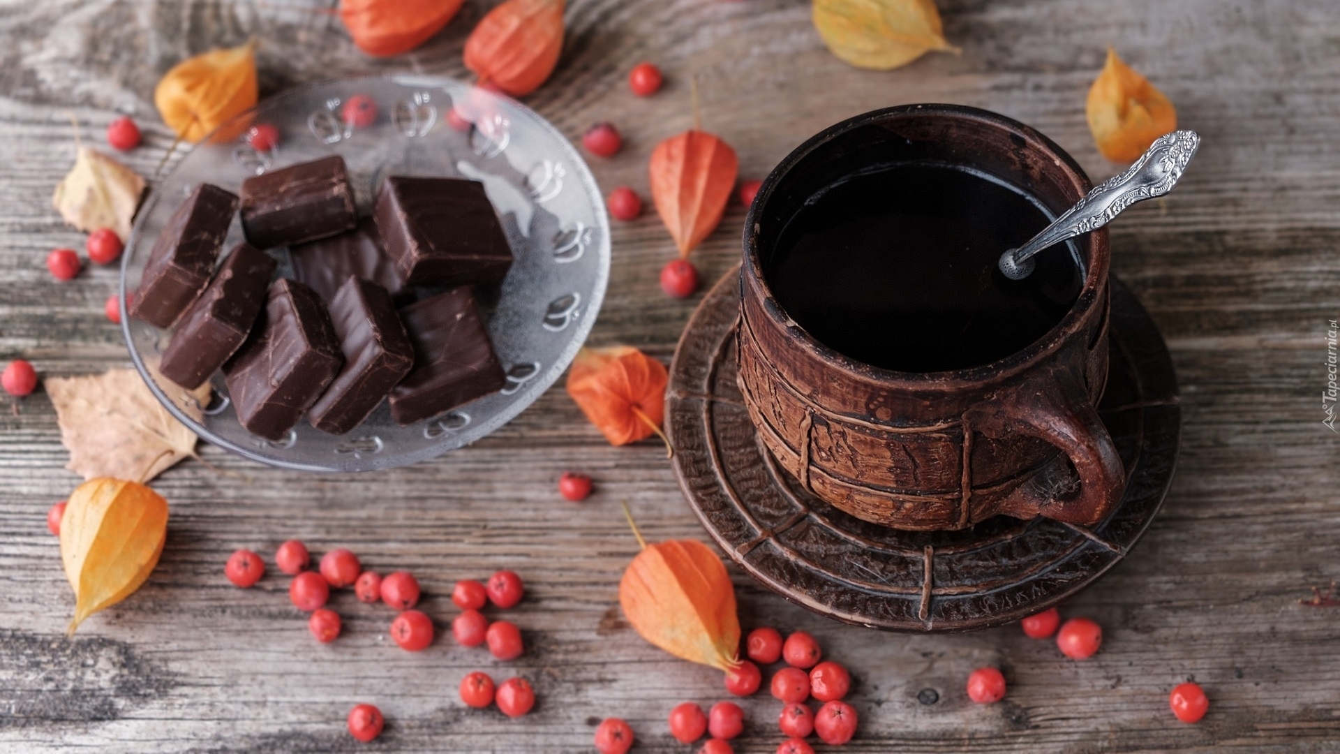 Edytor tapety: Ptasie mleczko na talerzyku obok kubka z kawą