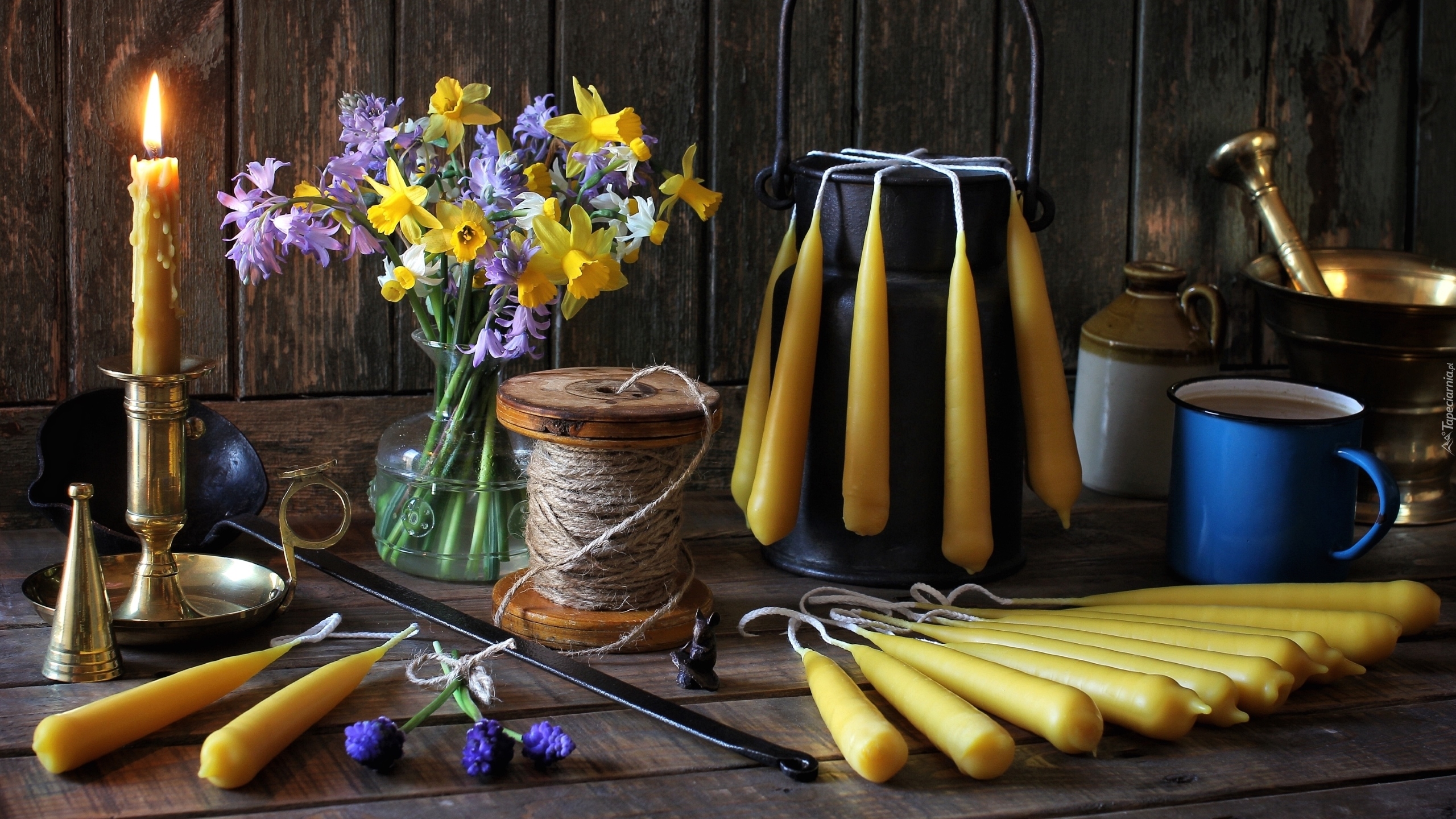 Edytor tapety: Bukiet kwiatów w wazonie obok świeczek