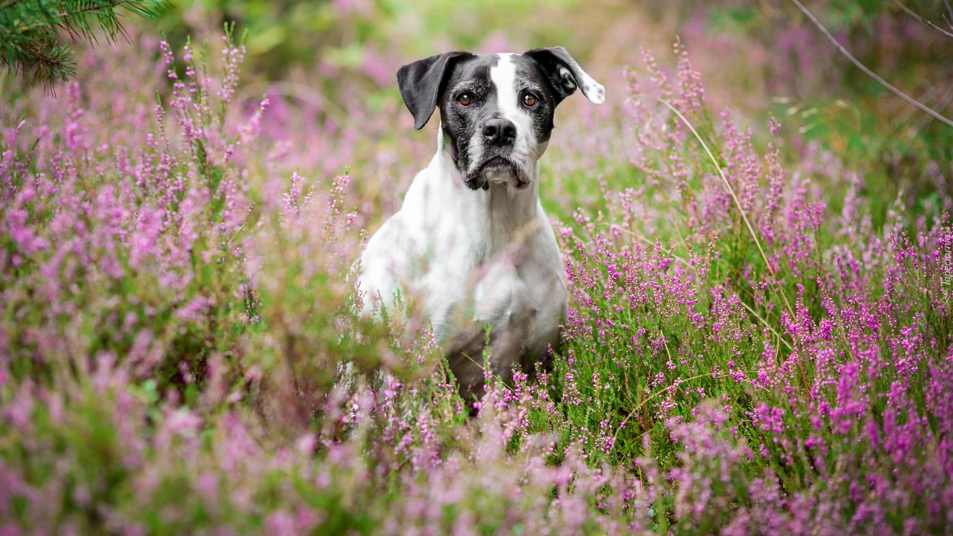 Edytor tapety: Łaciaty piesek we wrzosie
