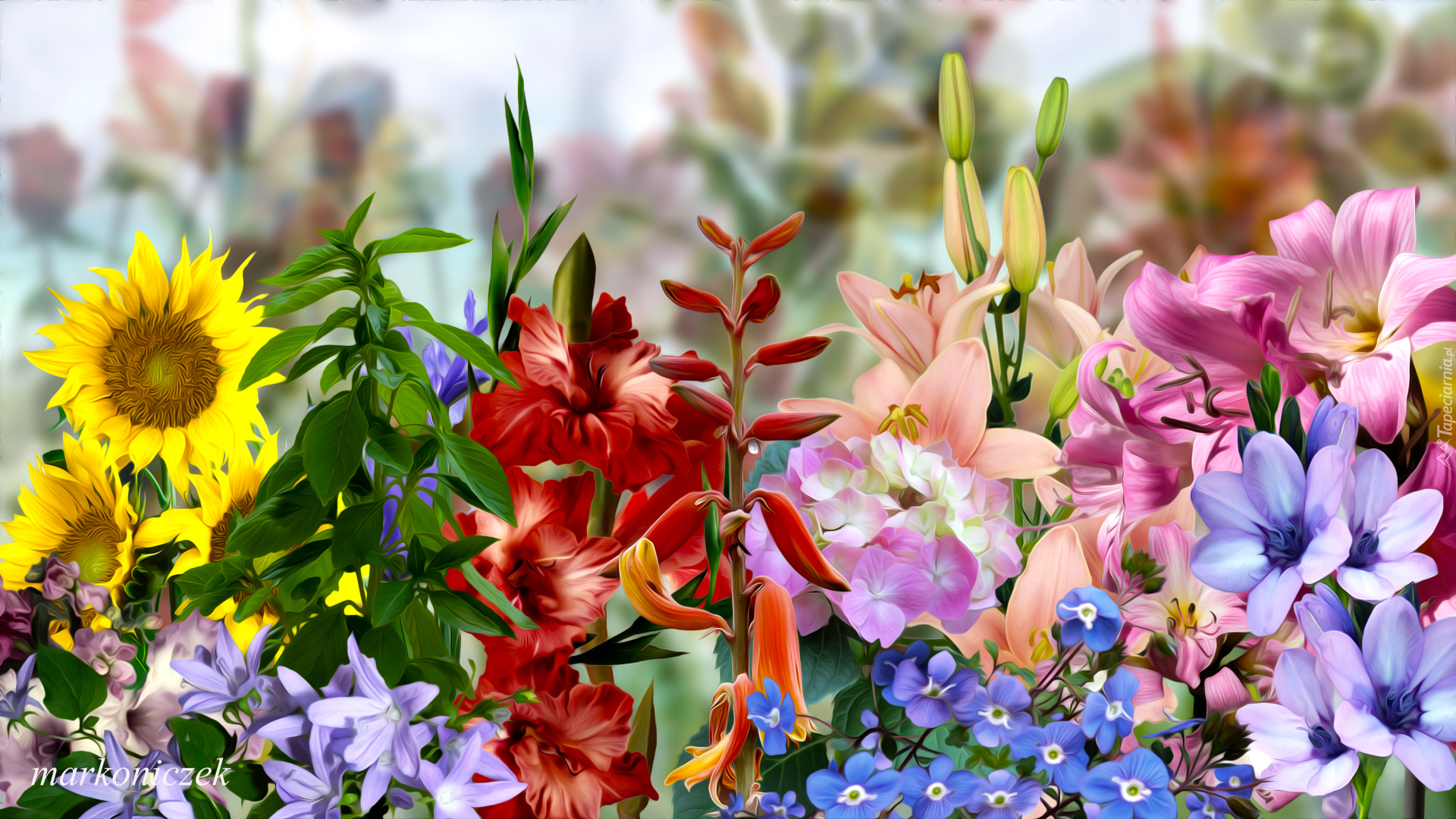 Edytor tapety: Kolorowe różnorodne kwiaty w grafice