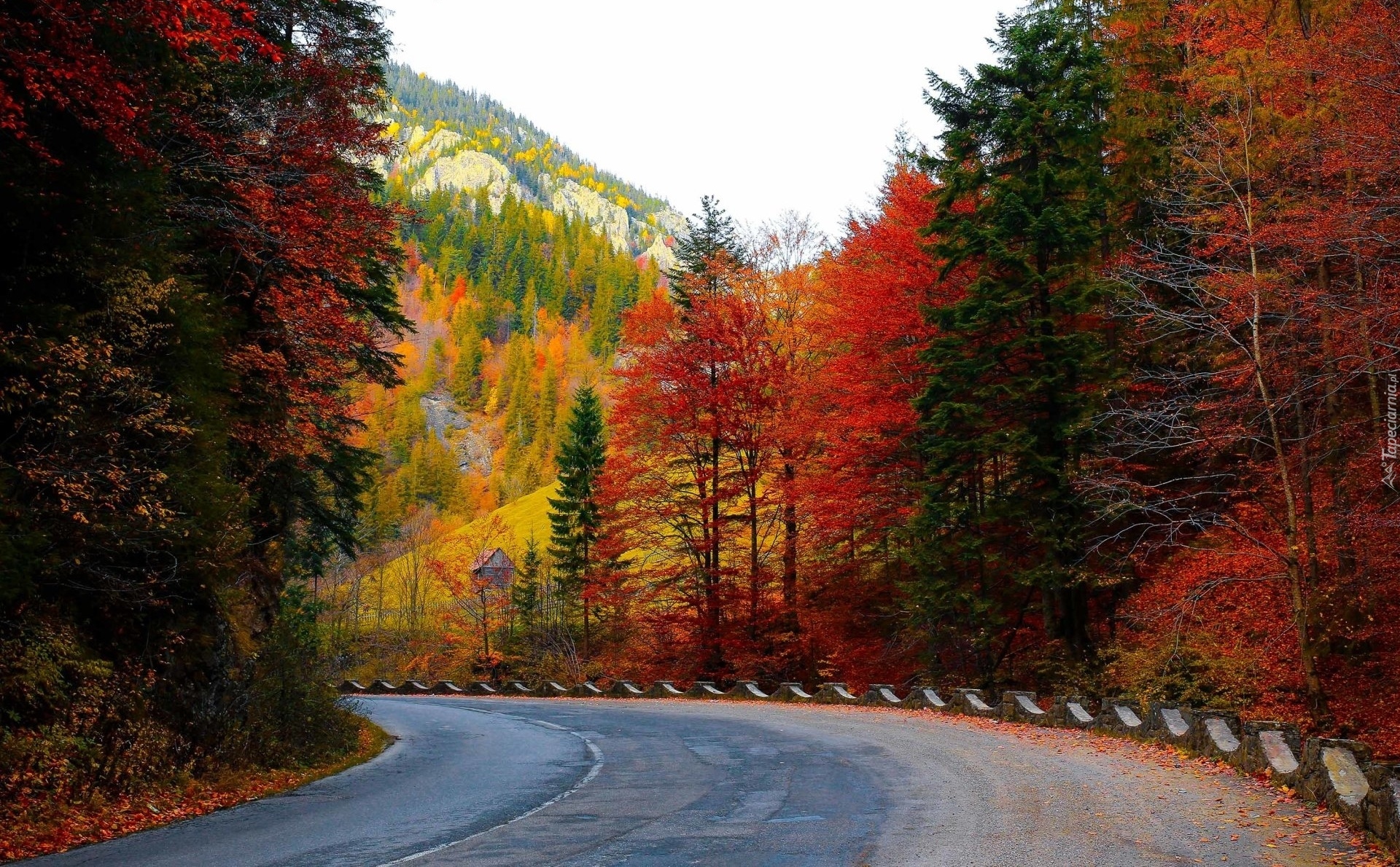 Edytor tapety: Kolorowe jesienne drzewa przy górskiej drodze