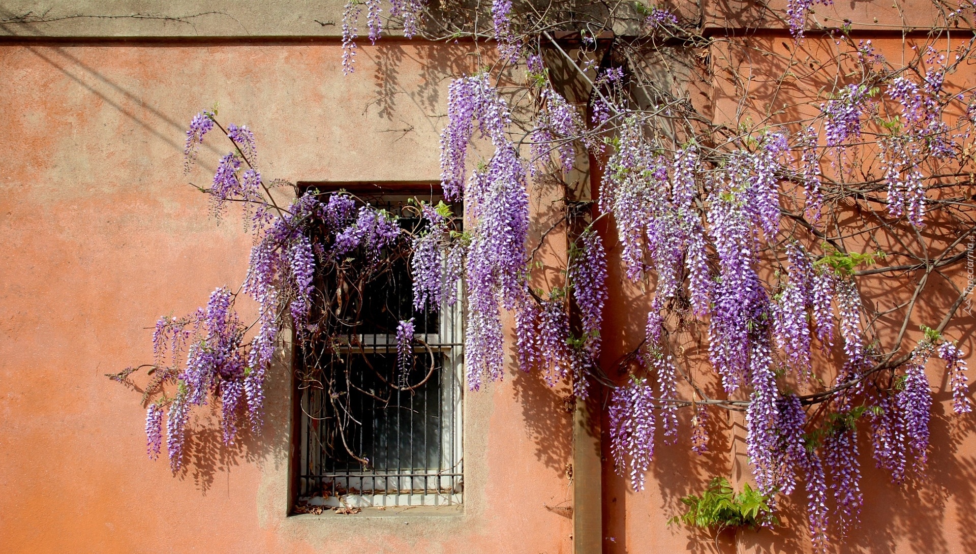 Edytor tapety: Kwitnąca glicynia obok ściany domu