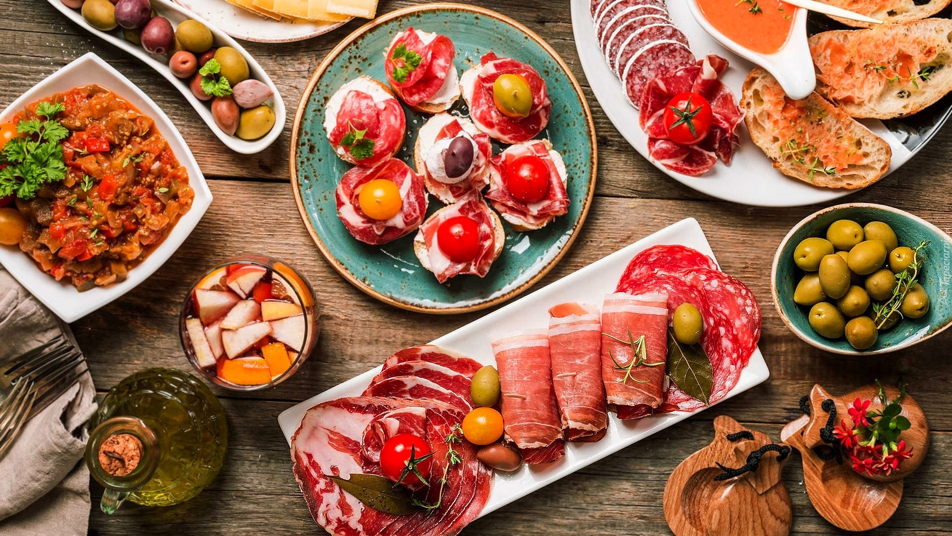 Edytor tapety: Wędliny, bigos i przekąski ustawione na deskach