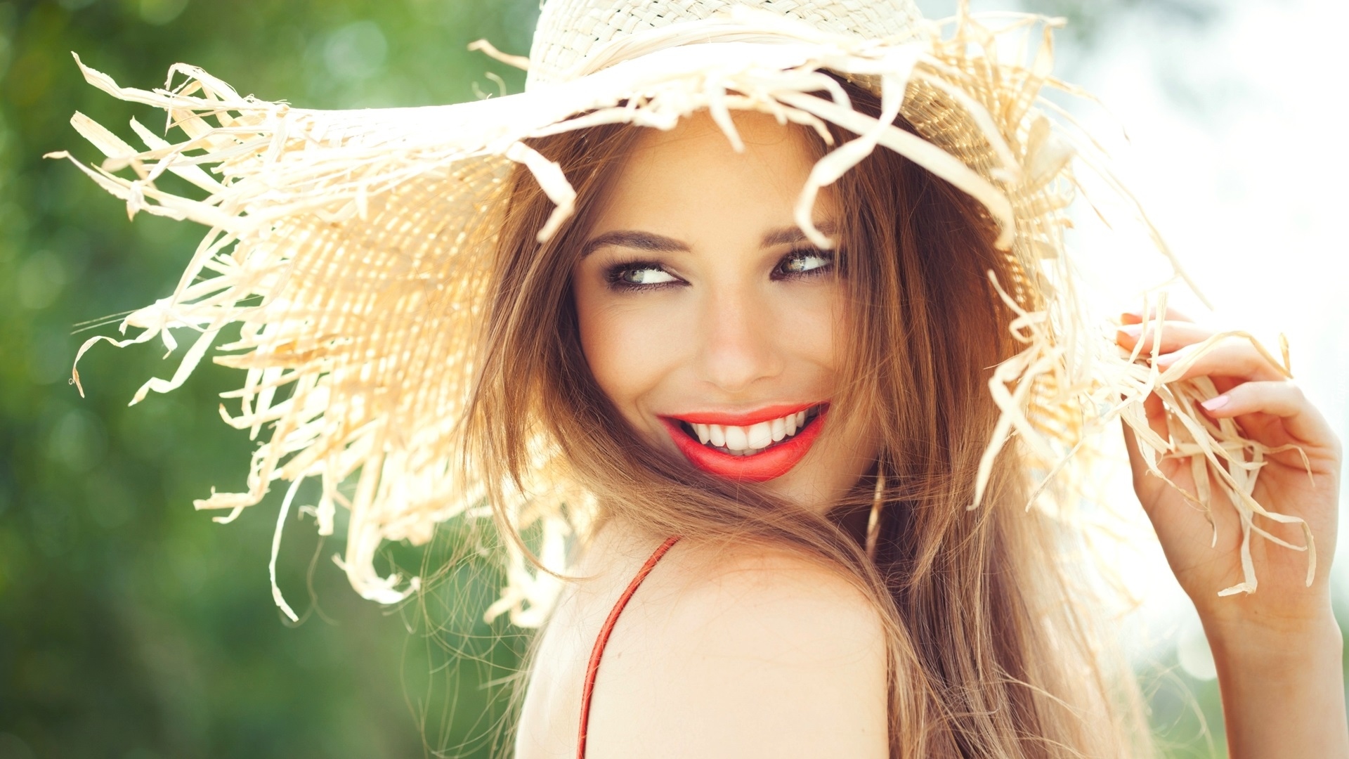 Edytor tapety: Uśmiechnięta kobieta w słomianym kapeluszu
