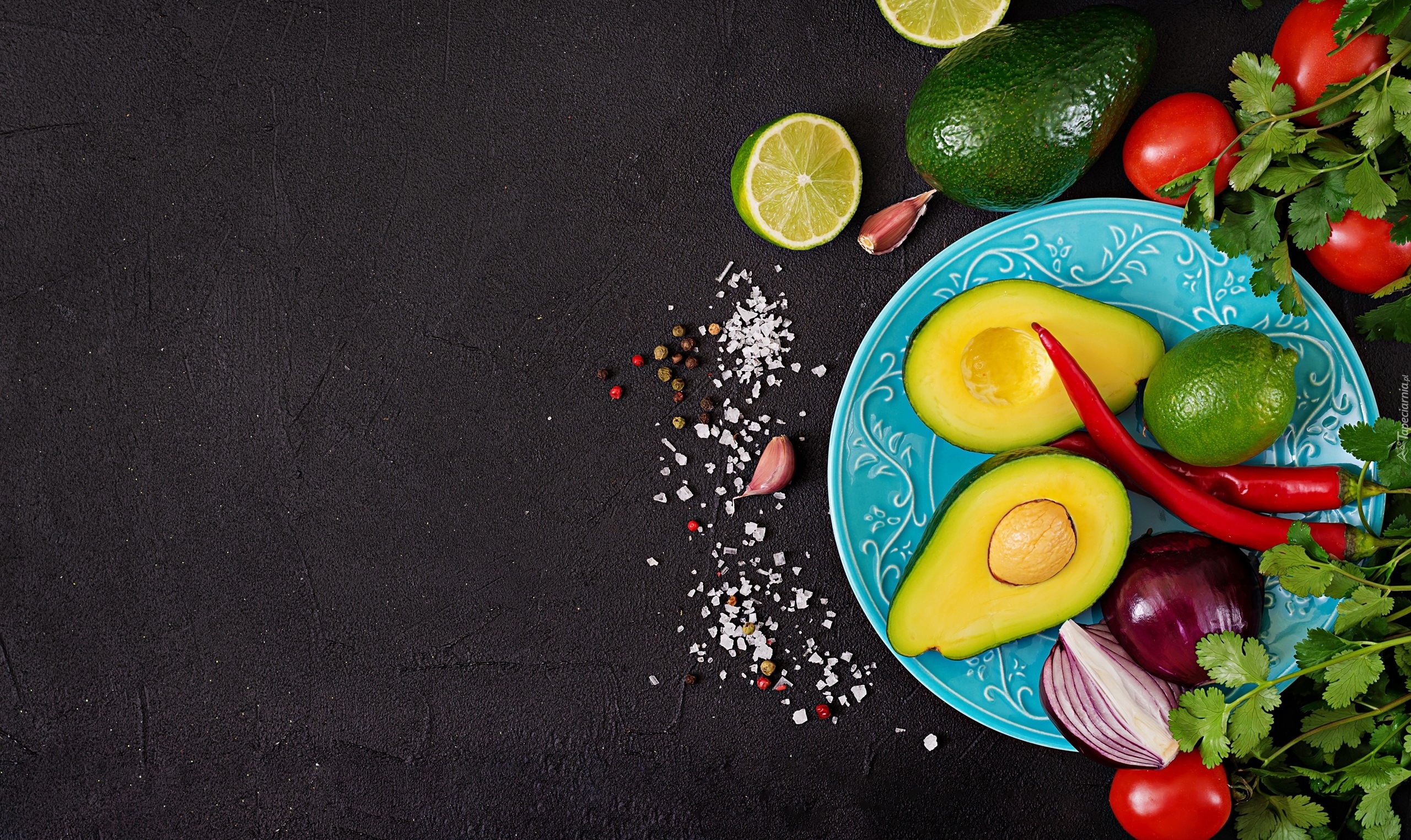Edytor tapety: Awokado obok cebuli i papryki