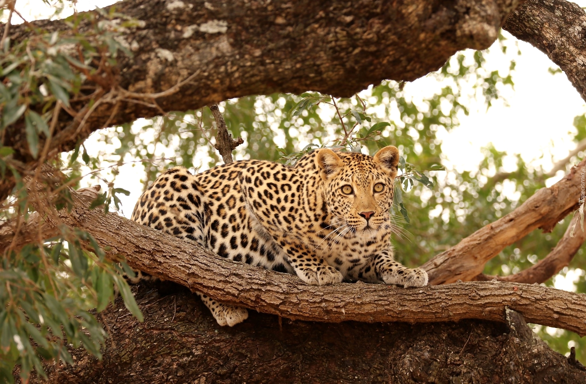 Edytor tapety: Przyczajony lampart na konarze drzewa