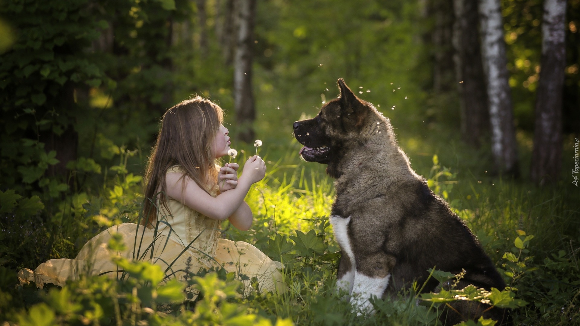 Edytor tapety: Dziewczynka i akita amerykańska w lesie