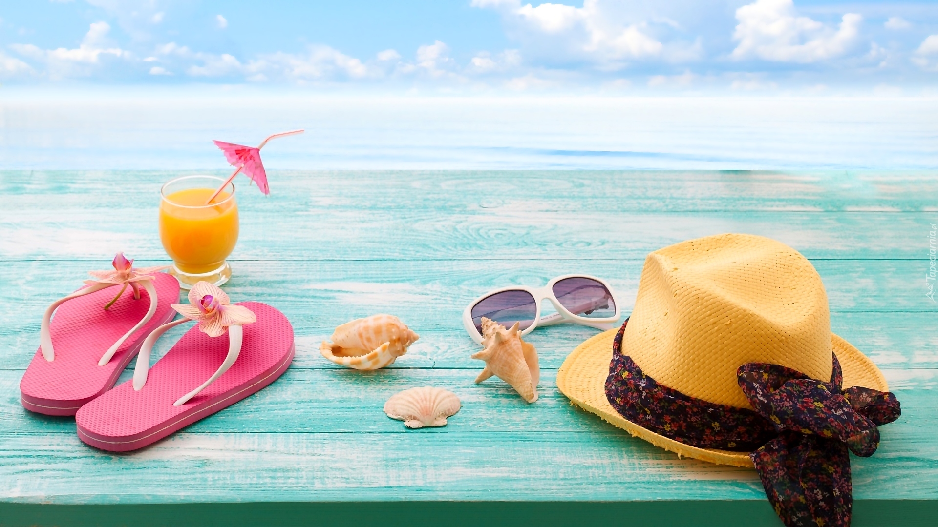 Edytor tapety: Klapki obok drinka i muszelek
