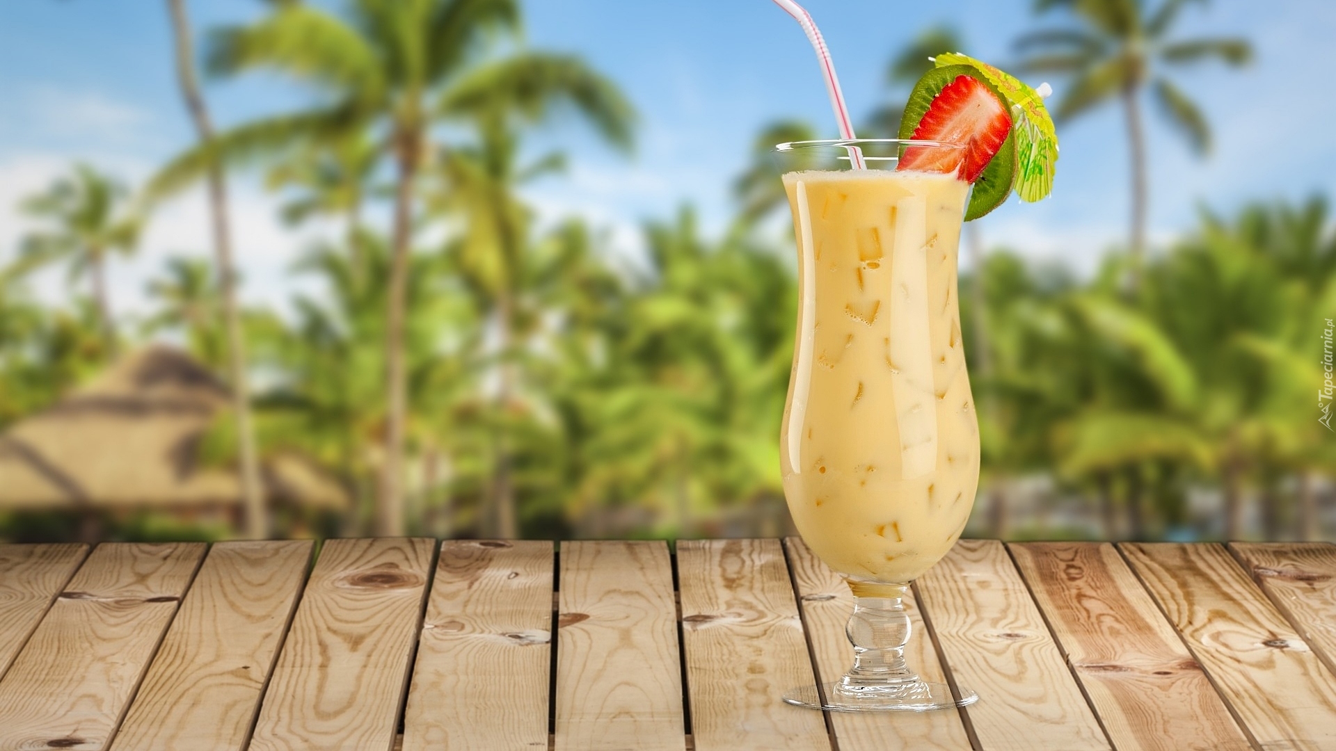 Edytor tapety: Koktajl z parasolką na deskach