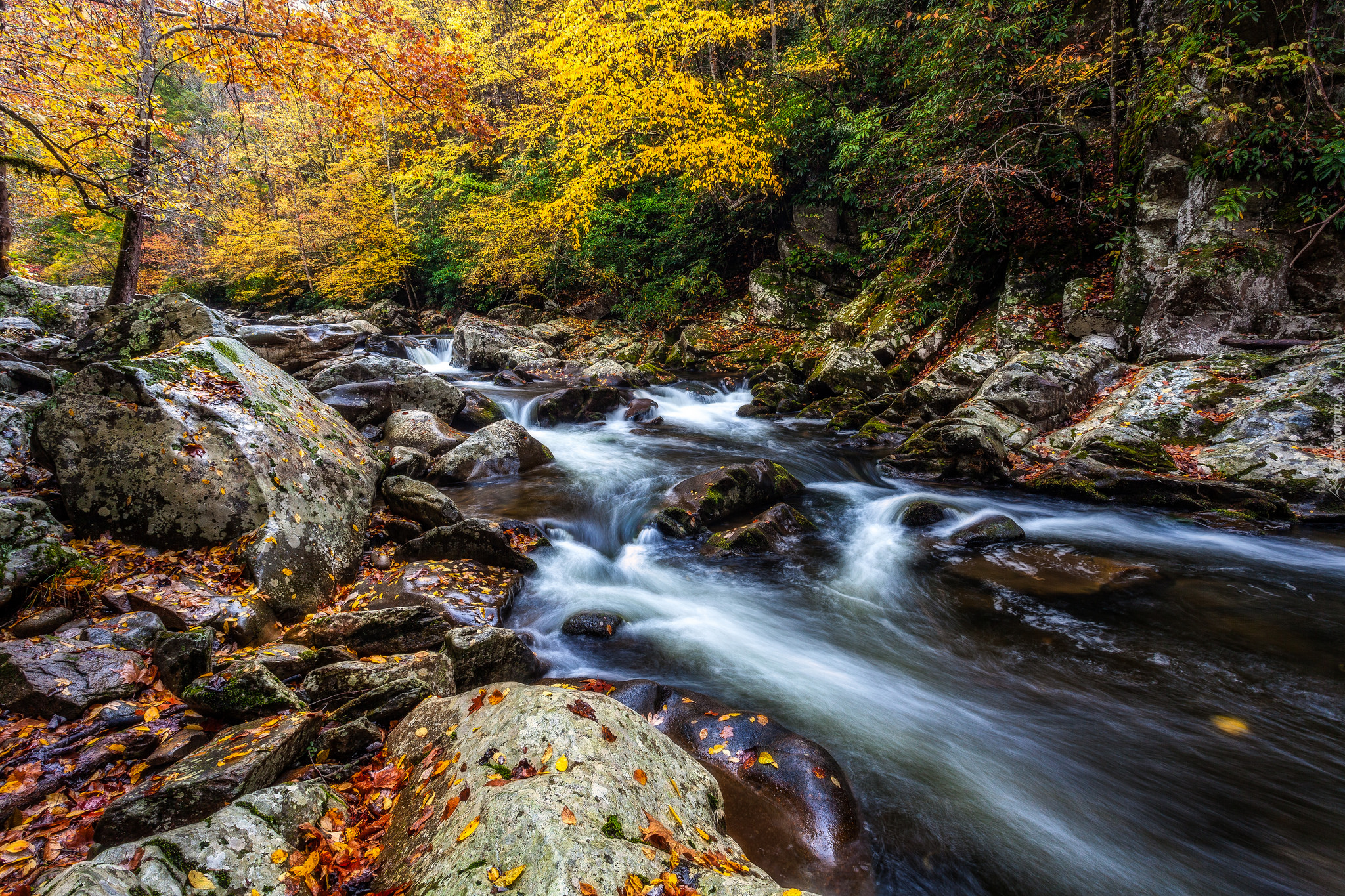 Edytor tapety: Rzeczka płynąca obok skał i kamieni