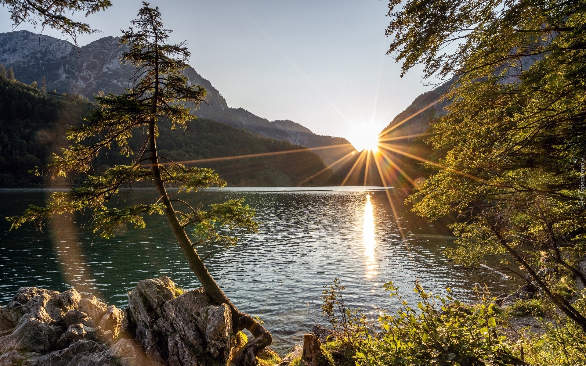 Edytor tapety: Austriackie jezioro Leopoldsteinersee w promieniach słonecznych