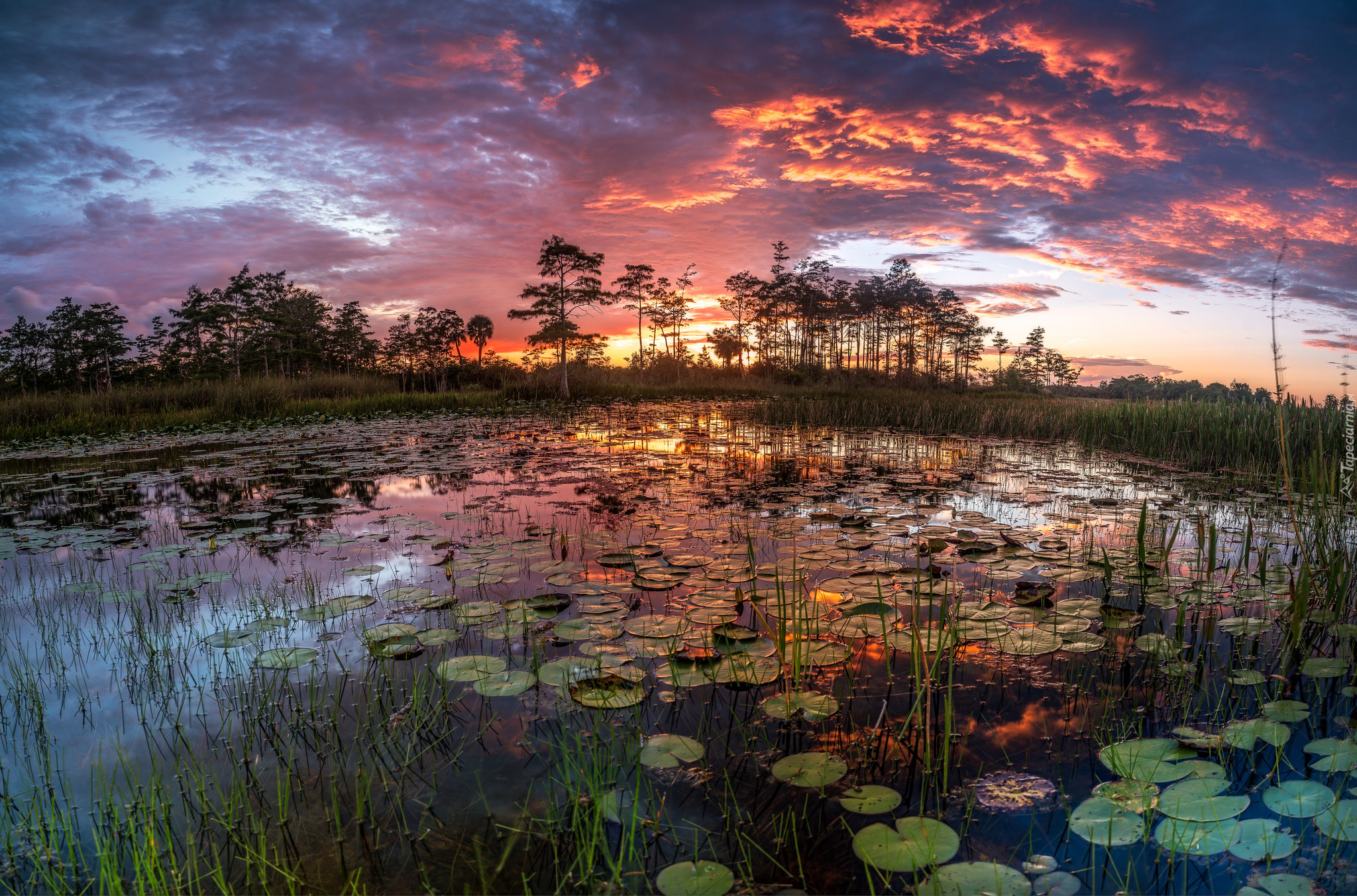 Edytor tapety: Zachód słońca nad jeziorem i drzewami