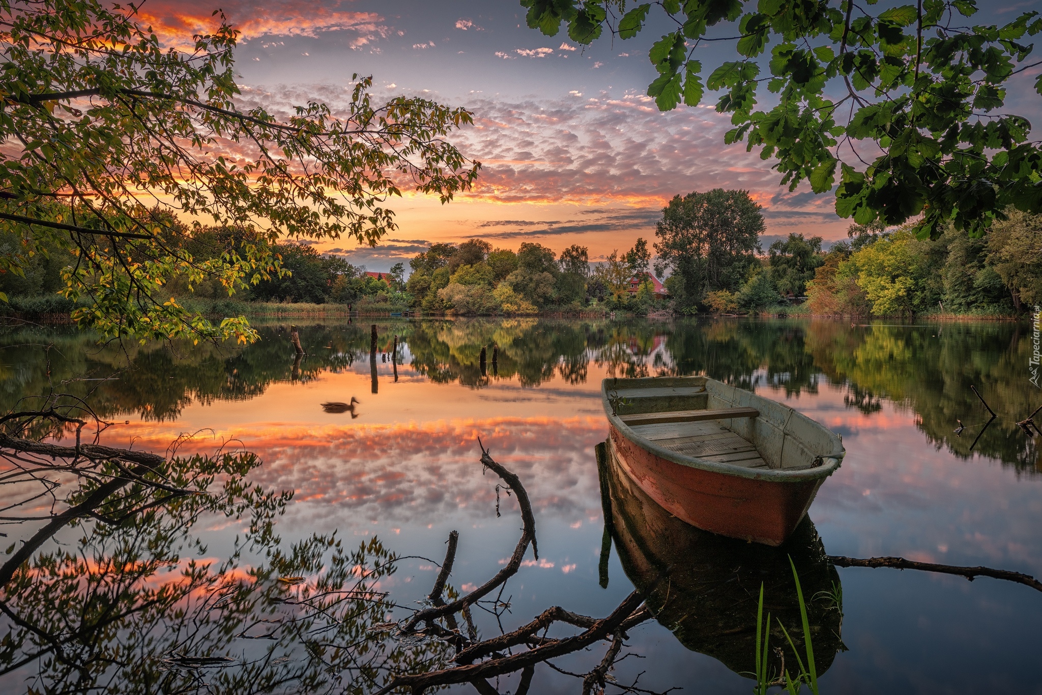Edytor tapety: Kaczka na jeziorze niedaleko łódki