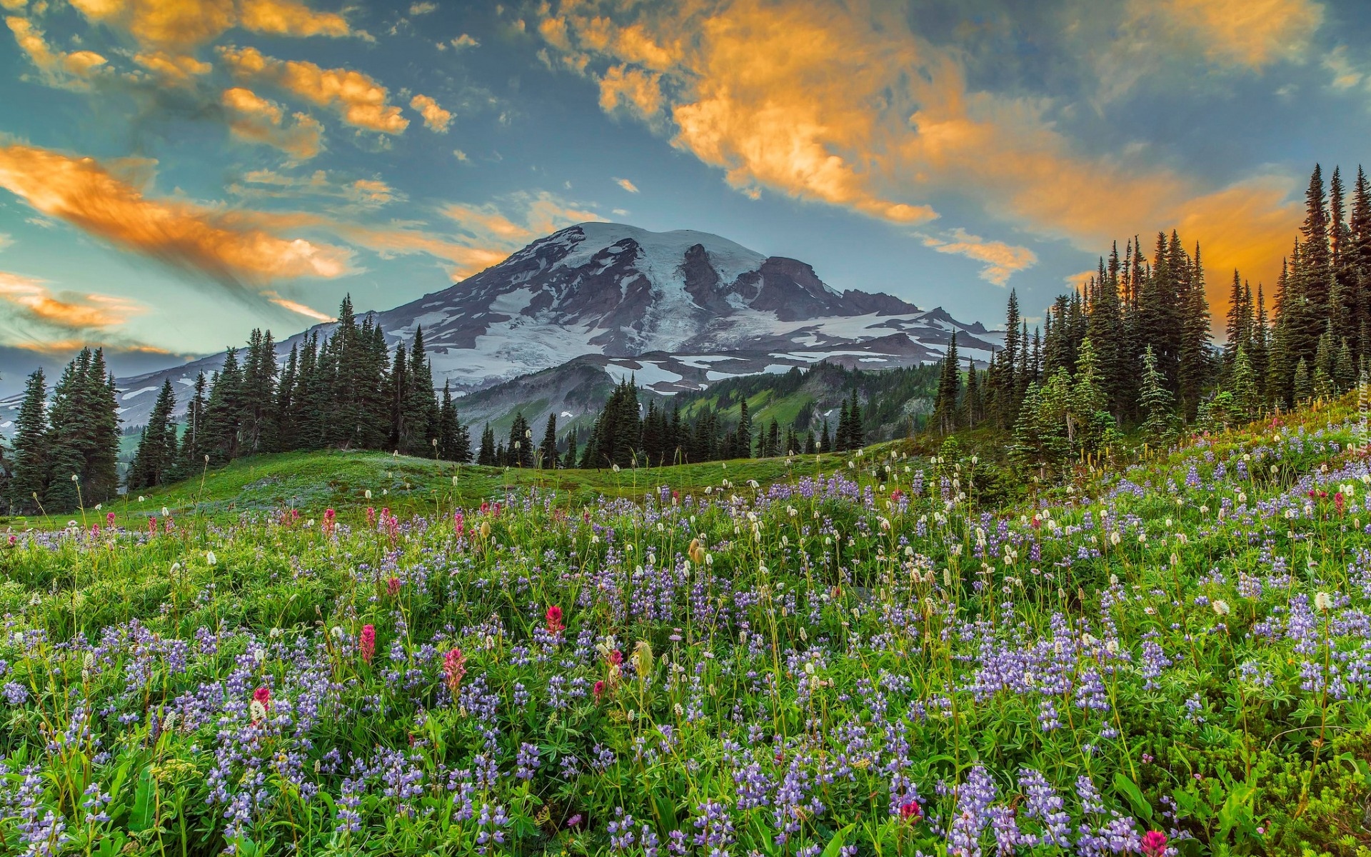 Edytor tapety: Łąka i drzewa na tle stratowulkanu Mount Rainier