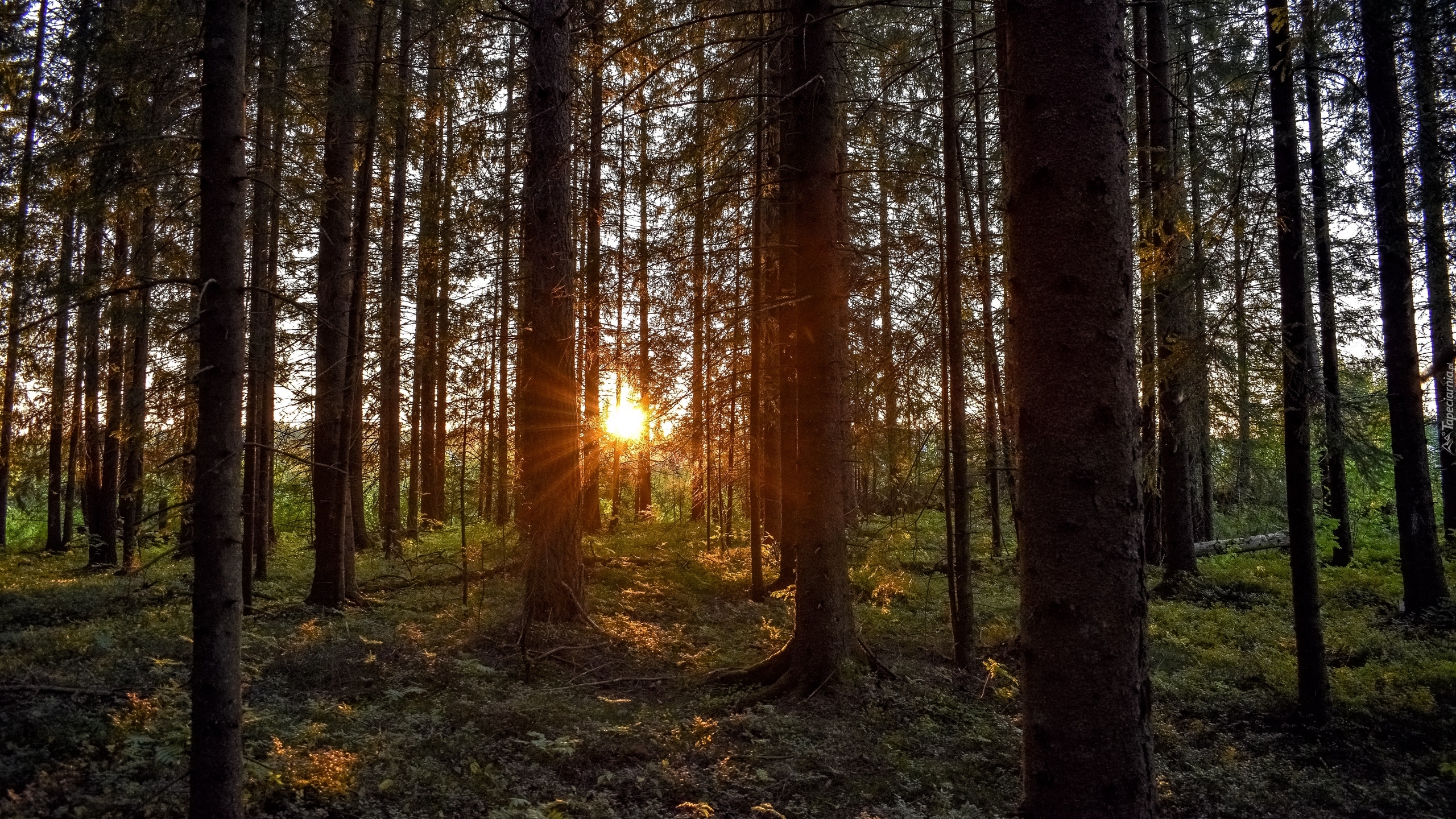 Edytor tapety: Promienie zachodzącego słońca między drzewami