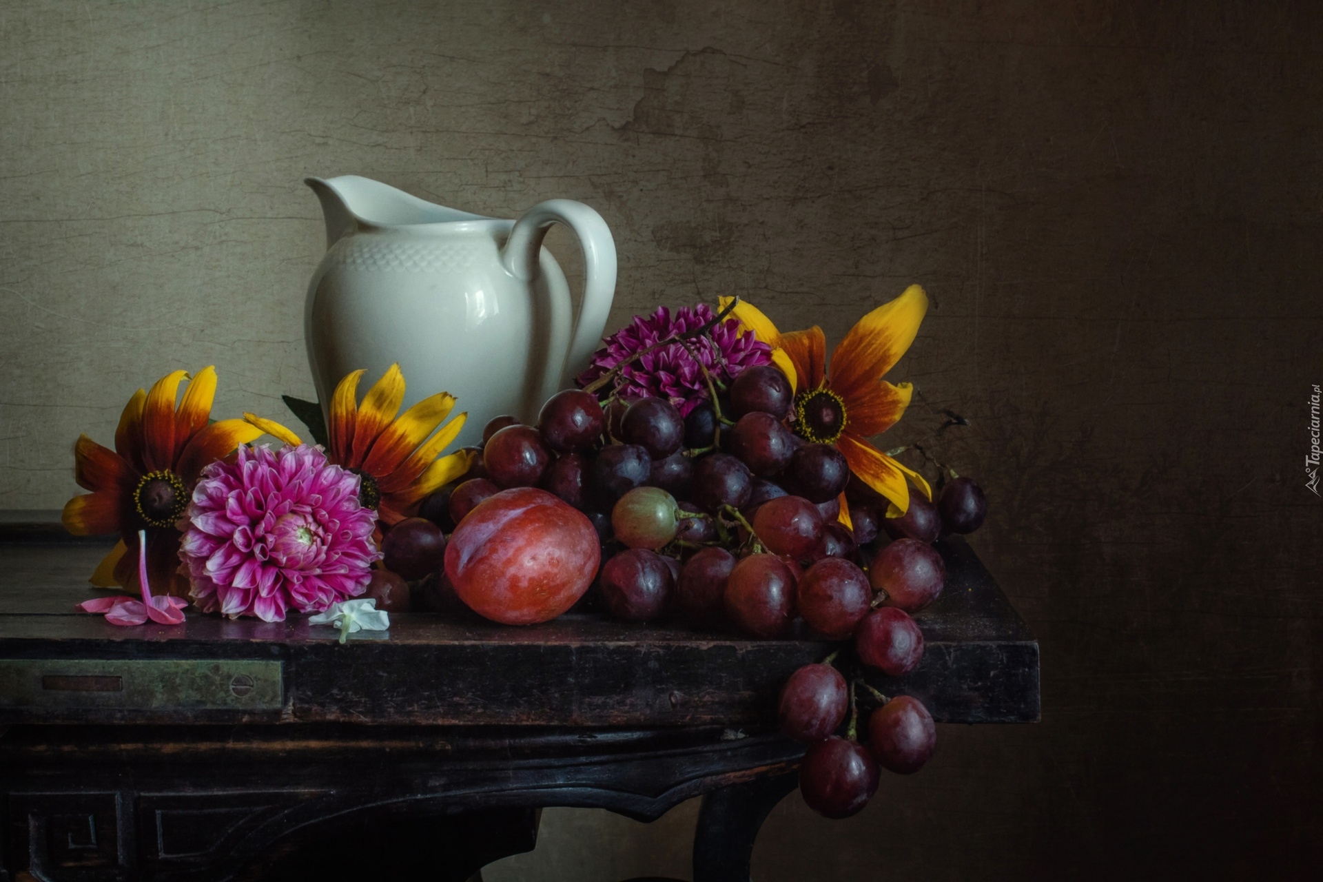 Edytor tapety: Winogrona w kompozycji z kwiatami i dzbankiem