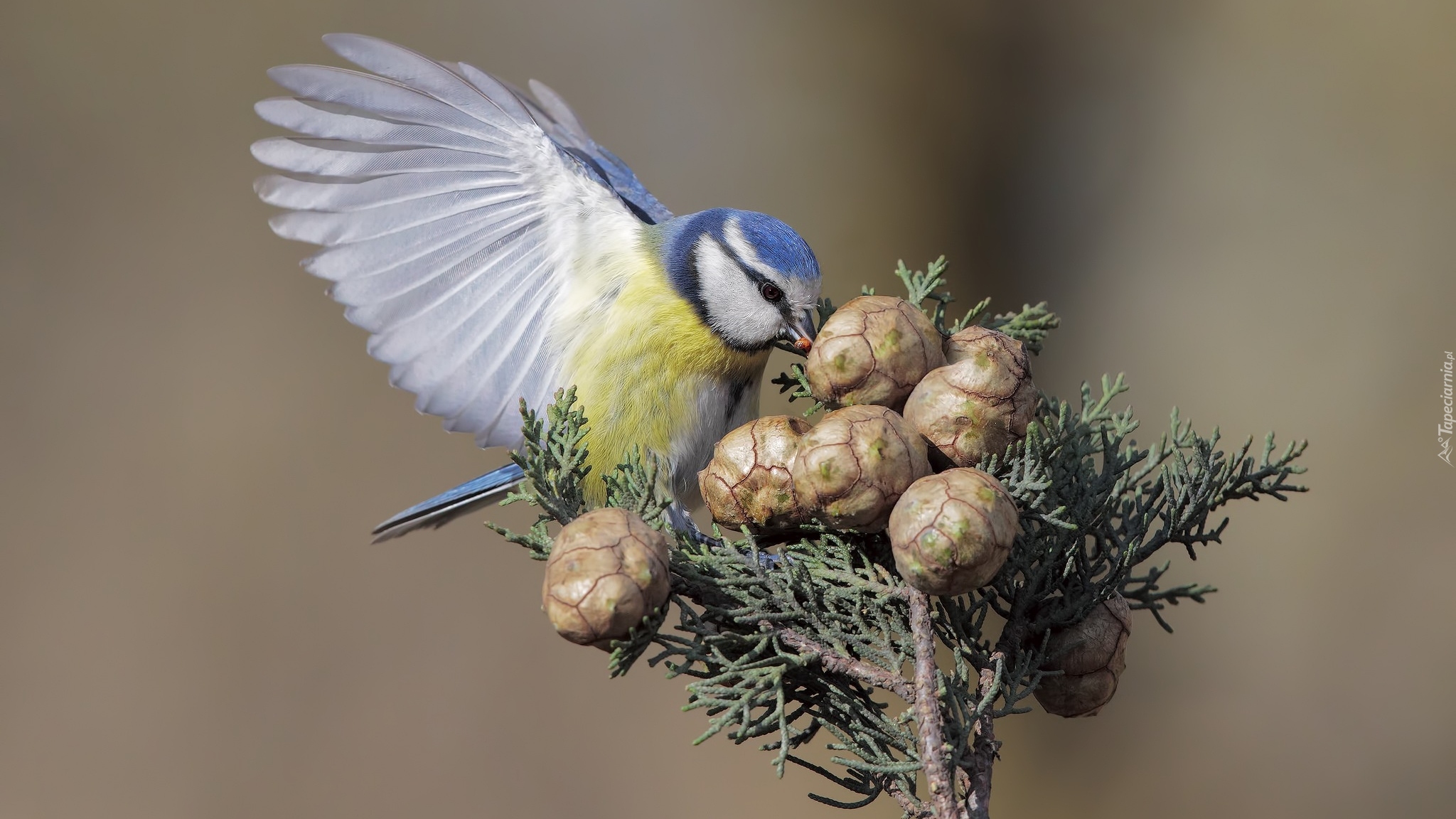 Edytor tapety: Modraszka zwyczajna na gałązce z szyszkami