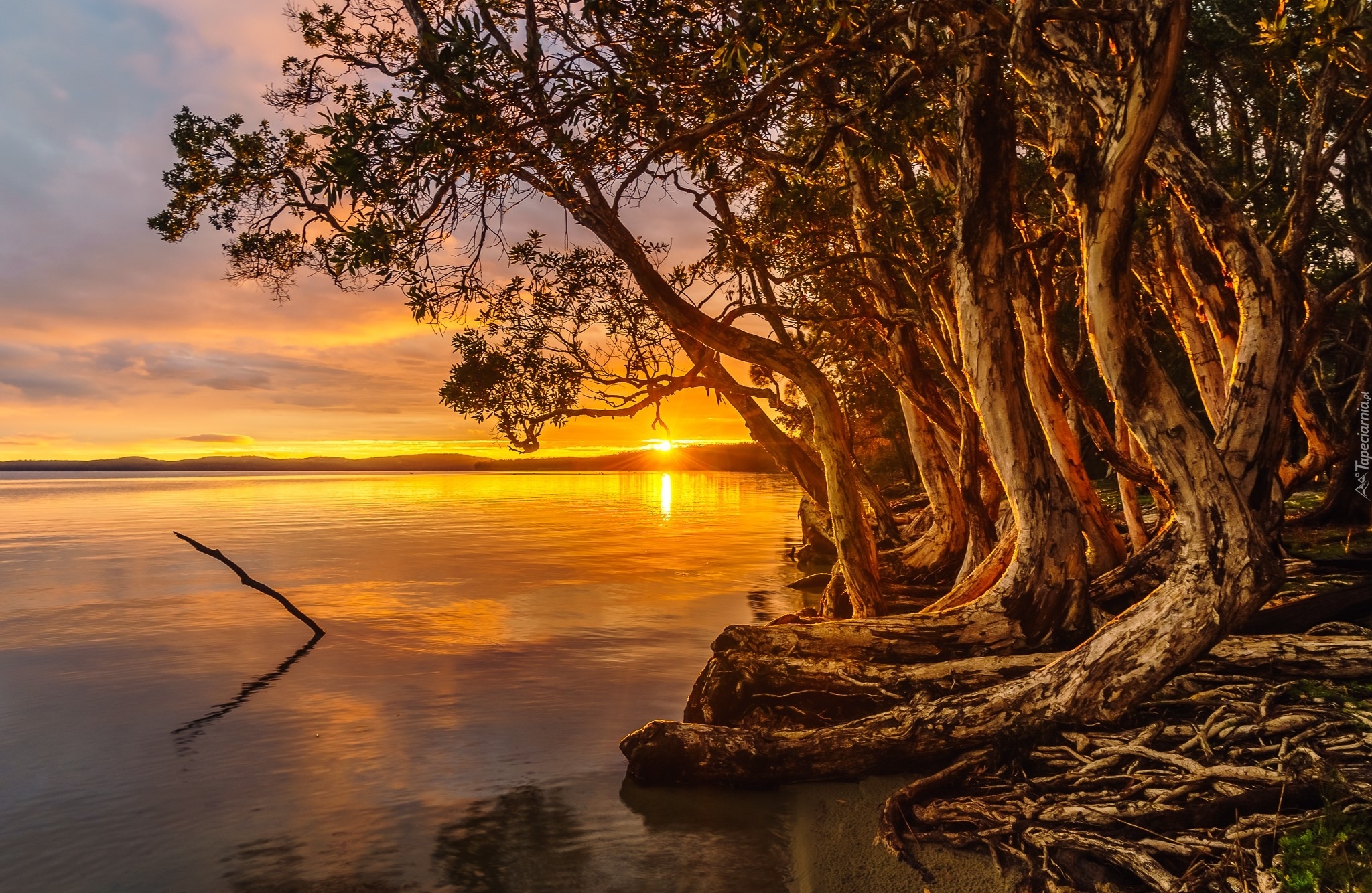 Edytor tapety: Drzewa nad jeziorem w blasku wschodzącego słońca
