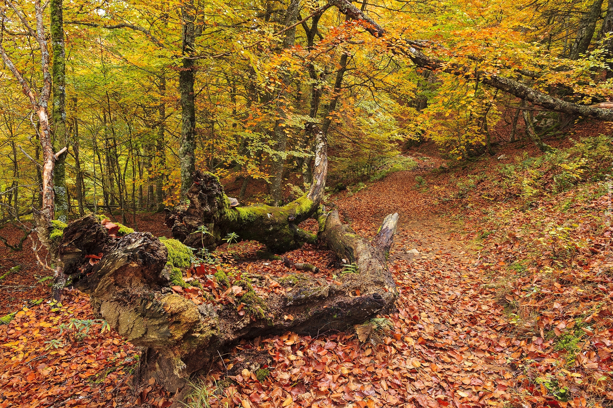 Edytor tapety: Przewrócone drzewo w jesiennym lesie