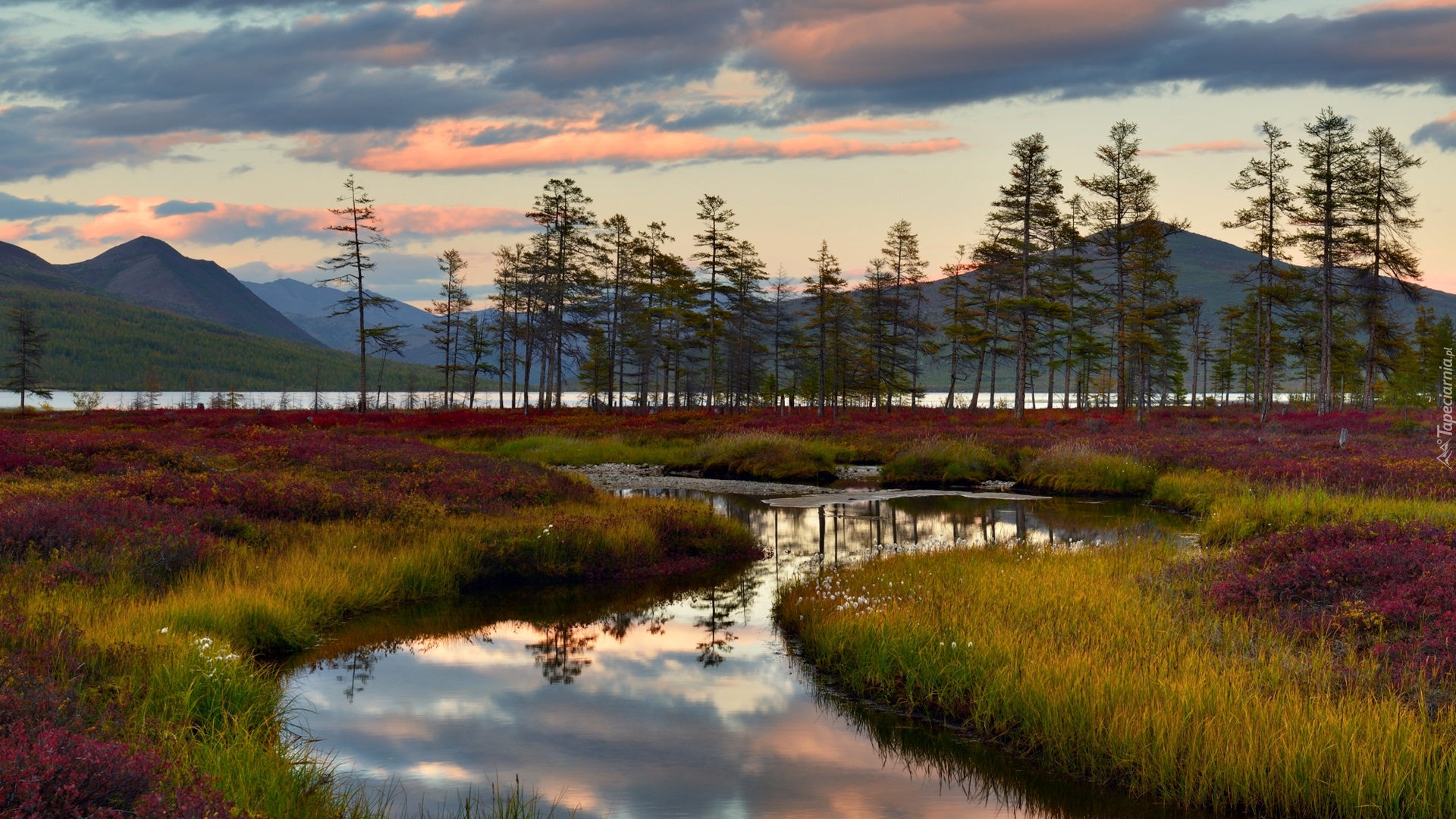 Edytor tapety: Drzewa przy jeziorze Jacka Londona na tle gór