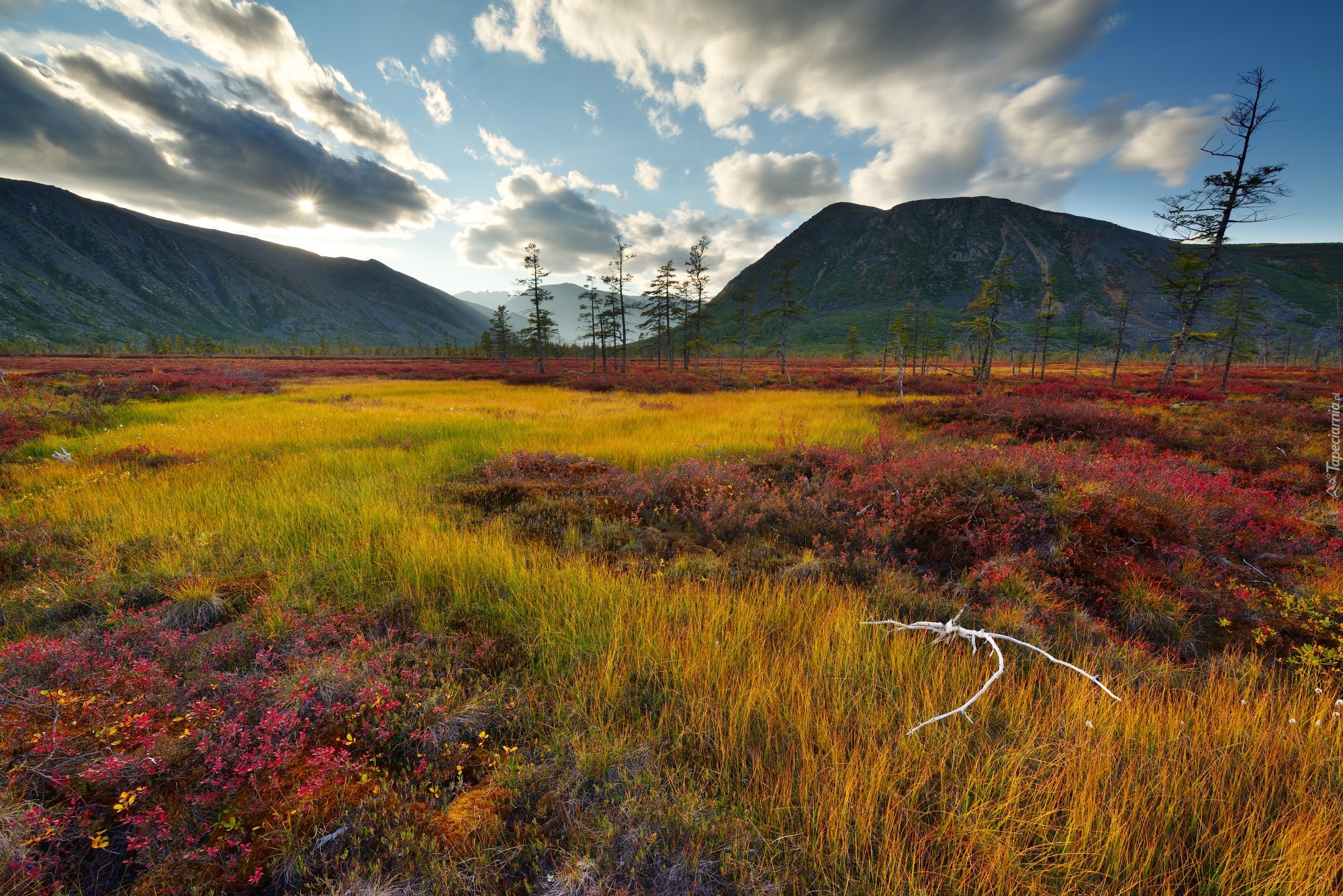 Edytor tapety: Kolorowe rośliny pośród traw na tle gór kołymskich