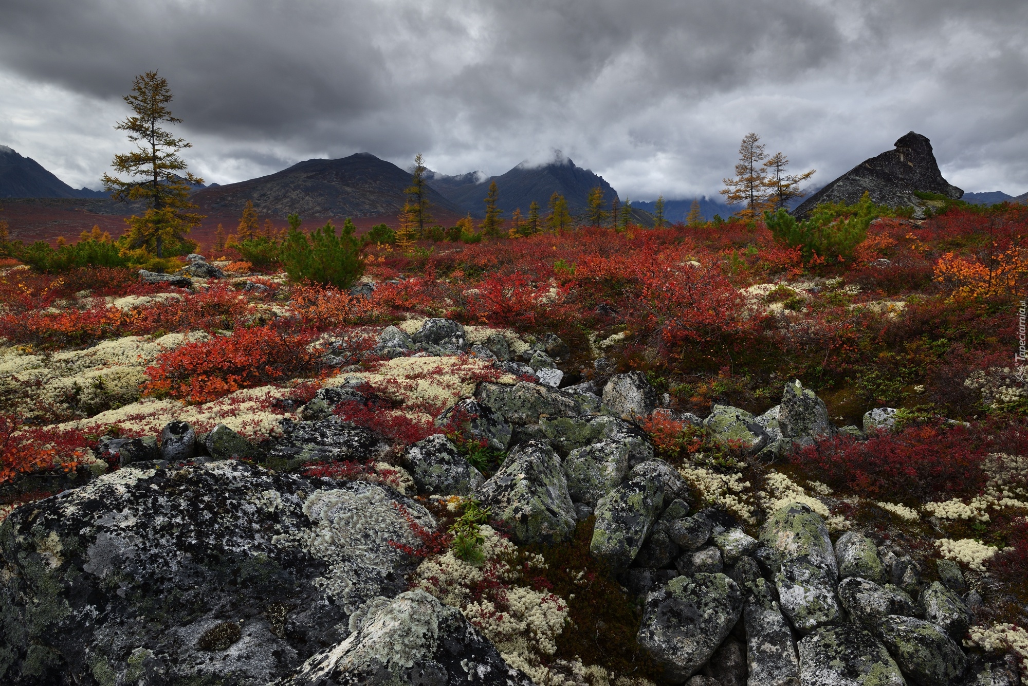 Edytor tapety: Roślinność na tle gór kołymskich jesienią