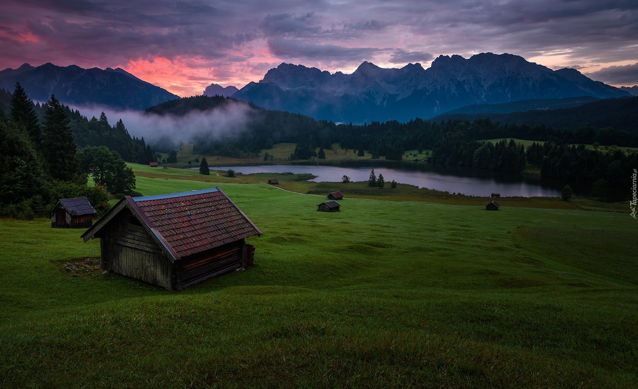 Edytor tapety: Chatki drewniane w miejscowości Krun nad jeziorem Geroldsee