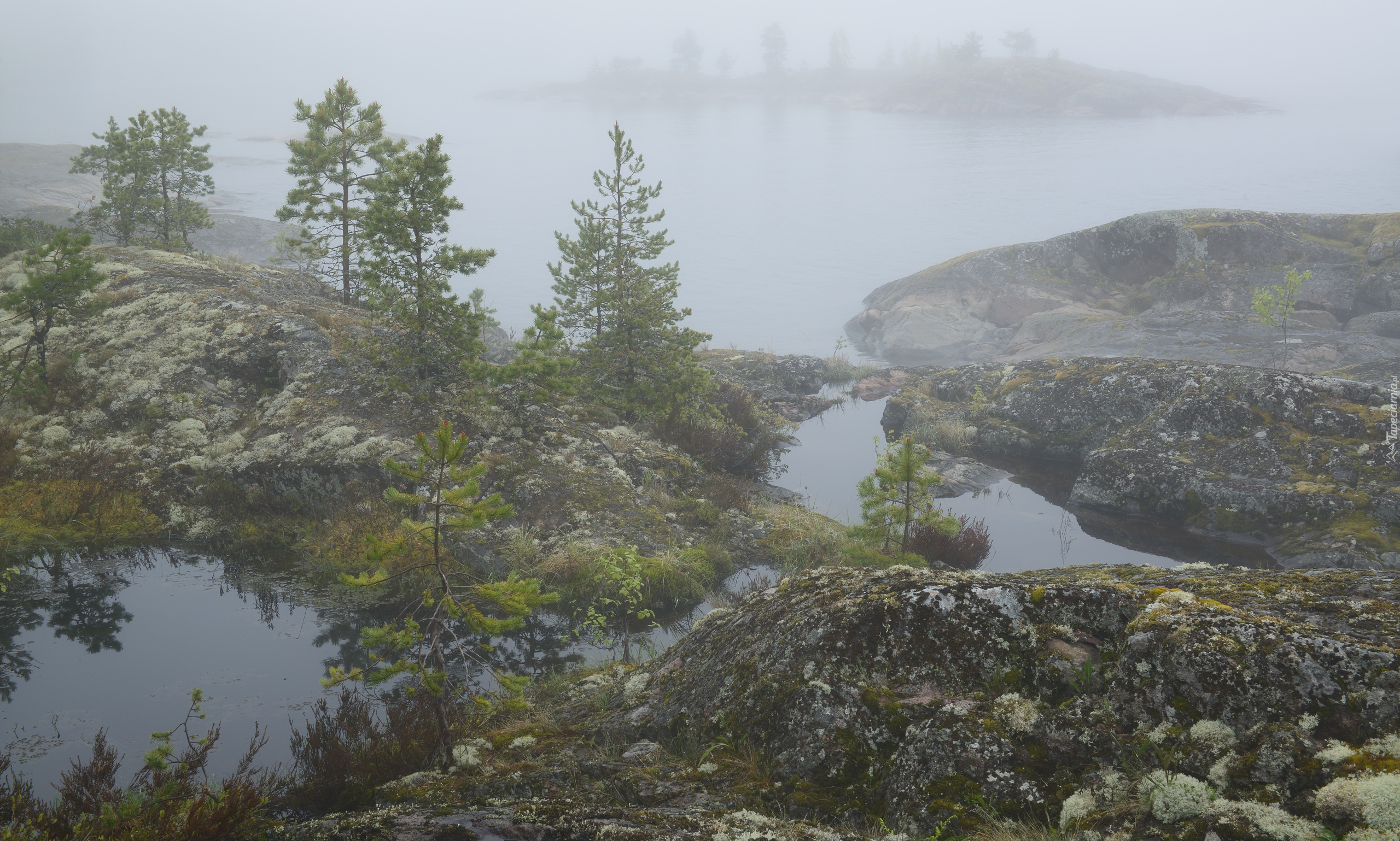 Edytor tapety: Skały na jeziorze Siegoziero we mgle
