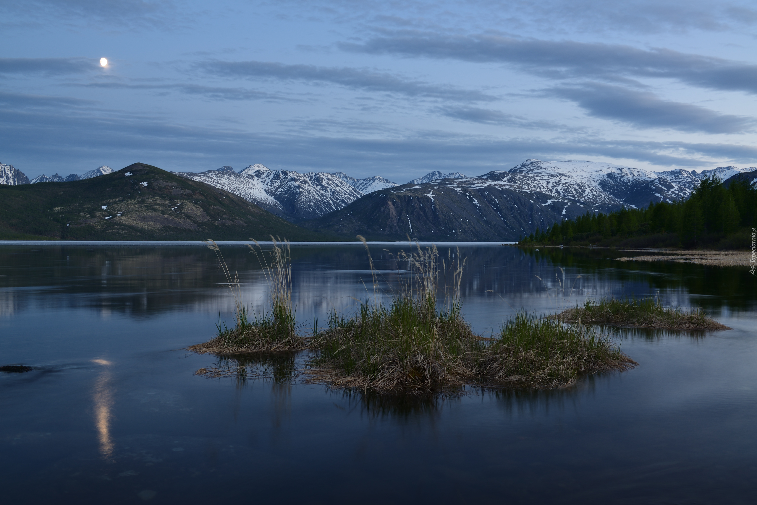 Edytor tapety: Kępki traw na jeziorze Jacka Londona o zmierzchu