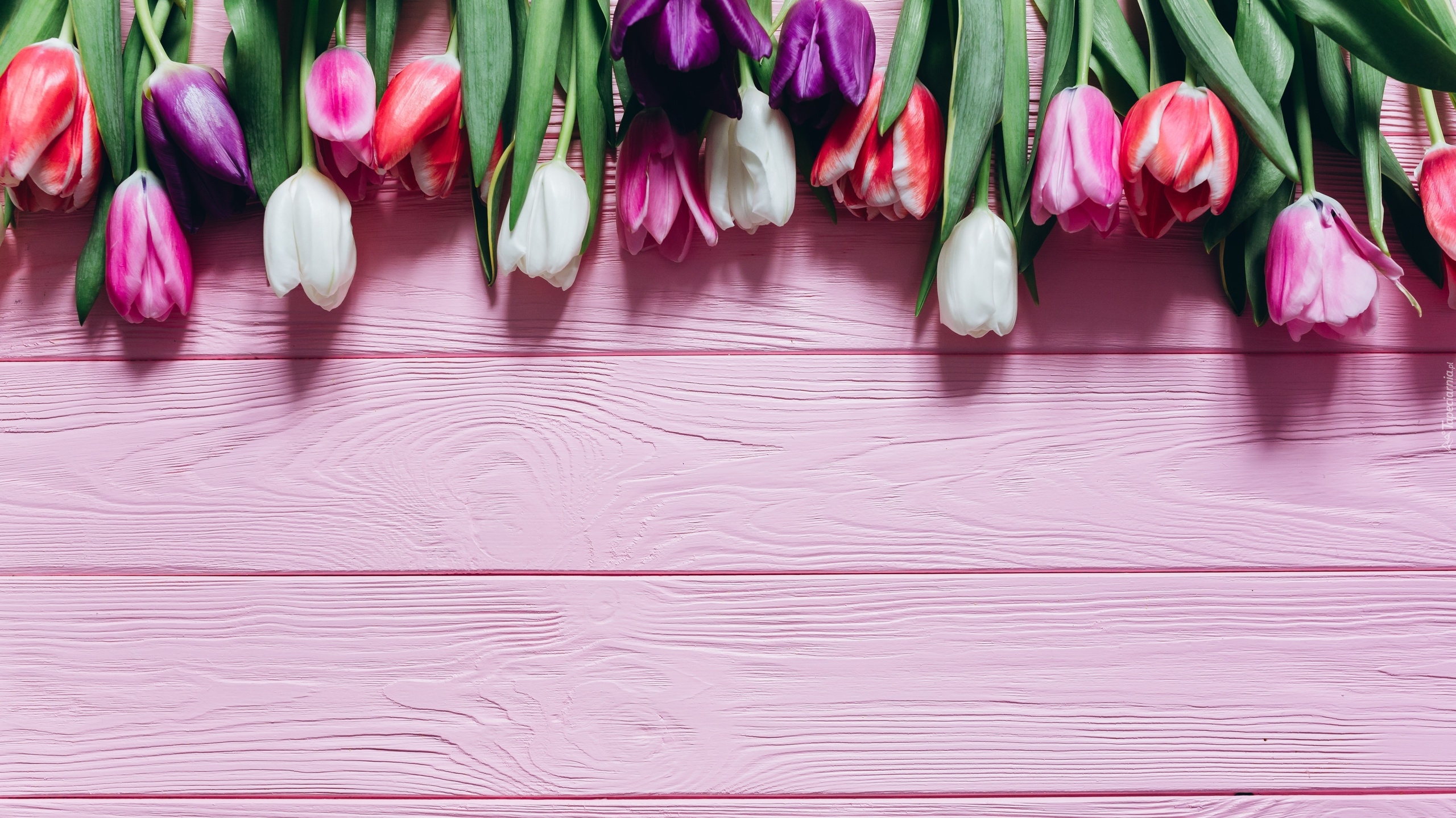 Edytor tapety: Kolorowe tulipany na różowych deskach