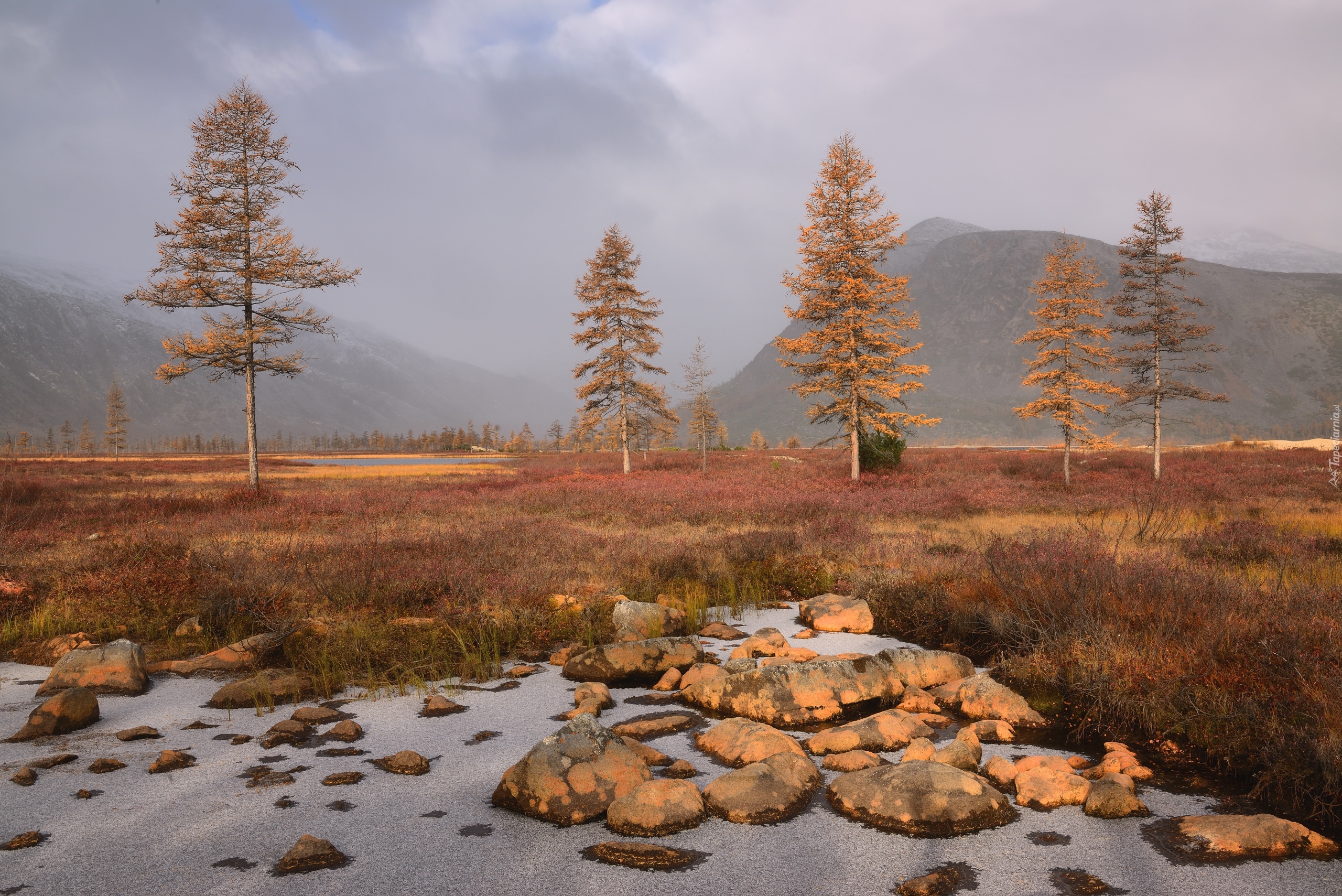 Edytor tapety: Drzewa na tle Gór Kołymskich osnutych mgłą