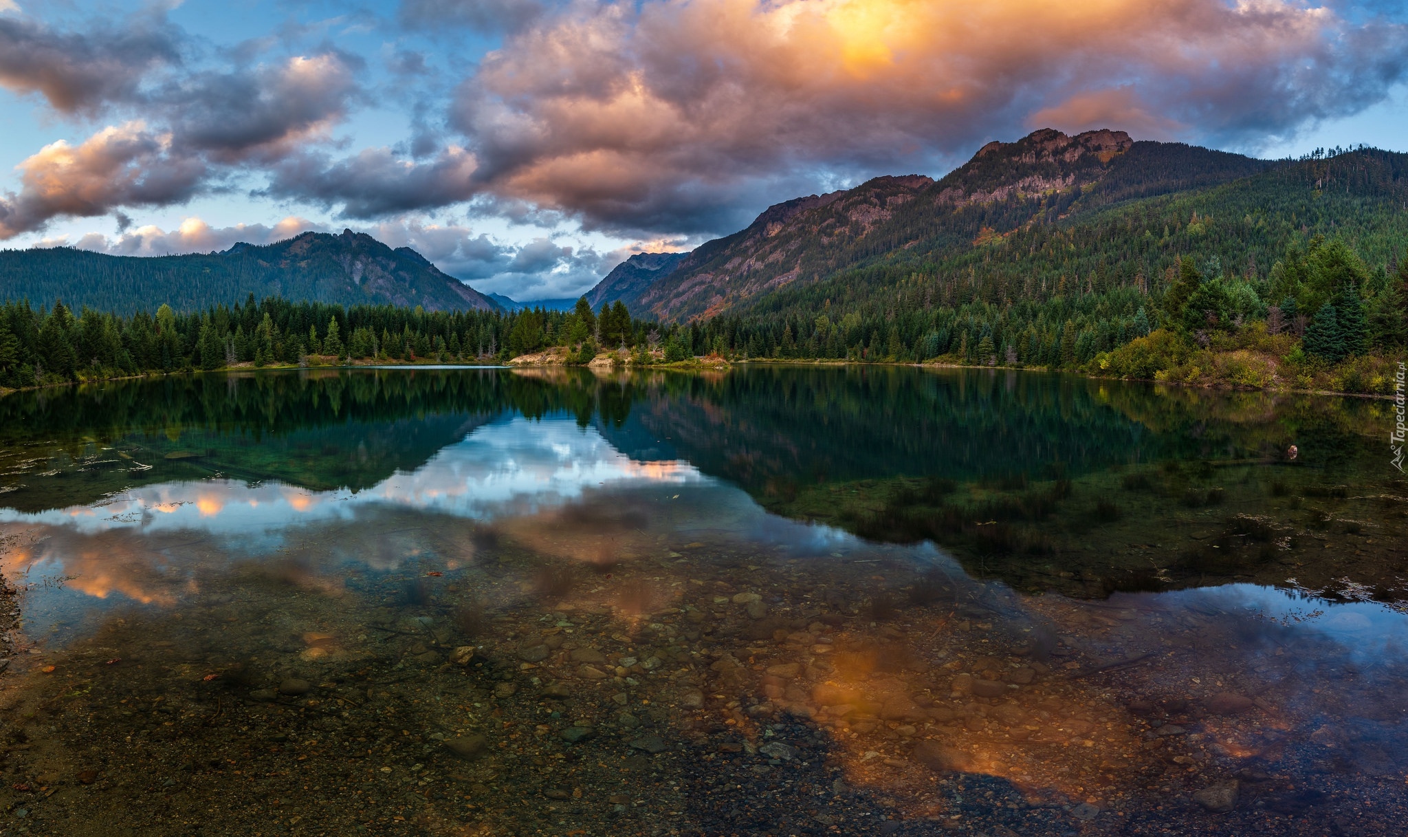 Edytor tapety: Chmury i góry odbijające się w jeziorze