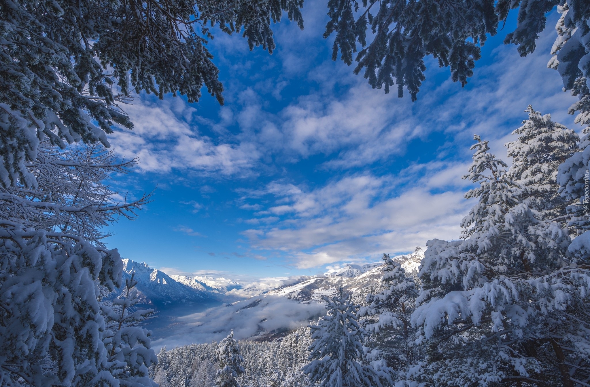 Edytor tapety: Ośnieżone świerki i szczyty gór