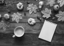 Edytor tapety: Notes położony na deskach obok filiżanki i liści