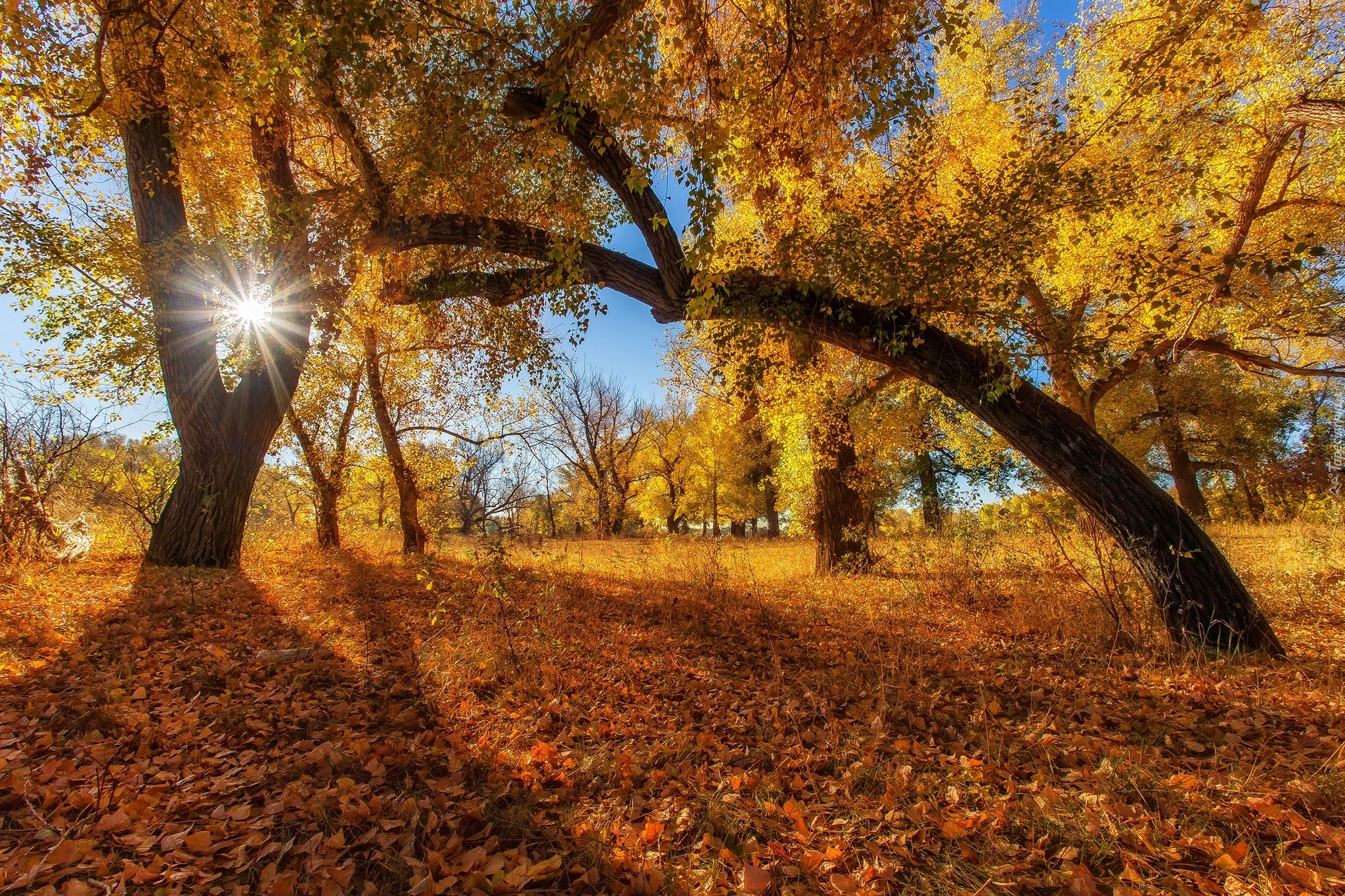 Edytor tapety: Pochylone drzewo w promieniach słońca