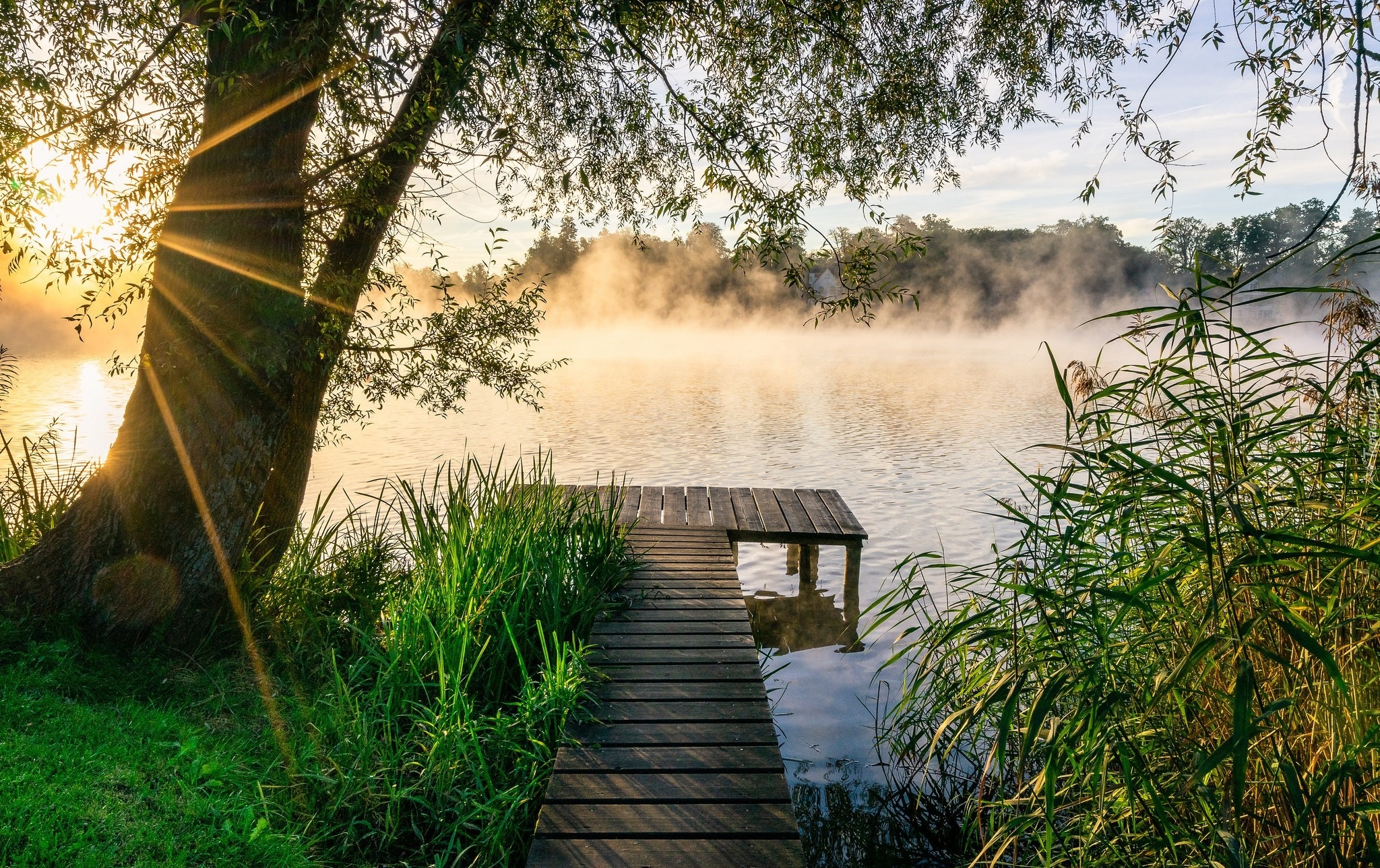 Edytor tapety: Pomost na jeziorze w promieniach słońca