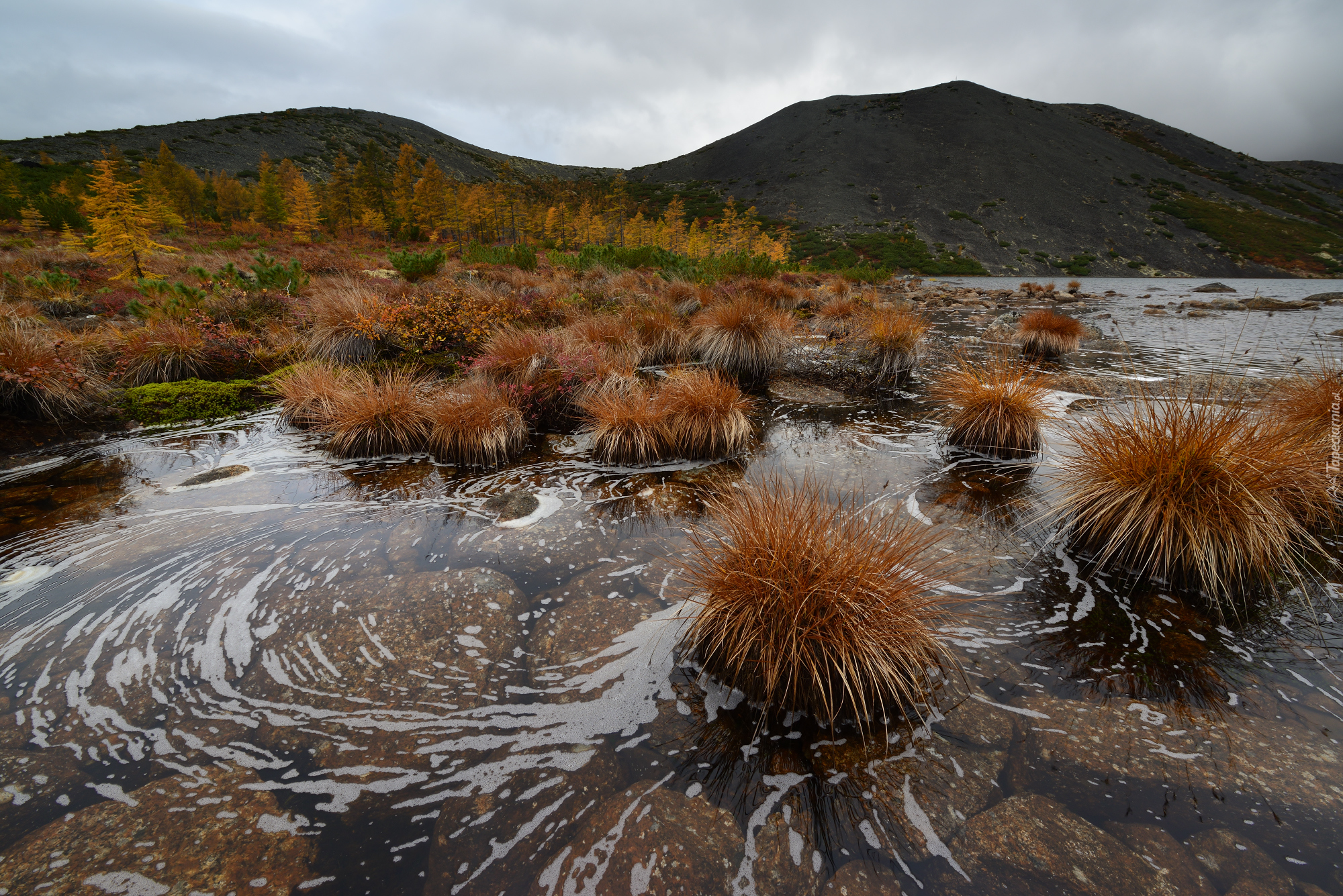 Edytor tapety: Kępy traw przy brzegu jeziora Anemone