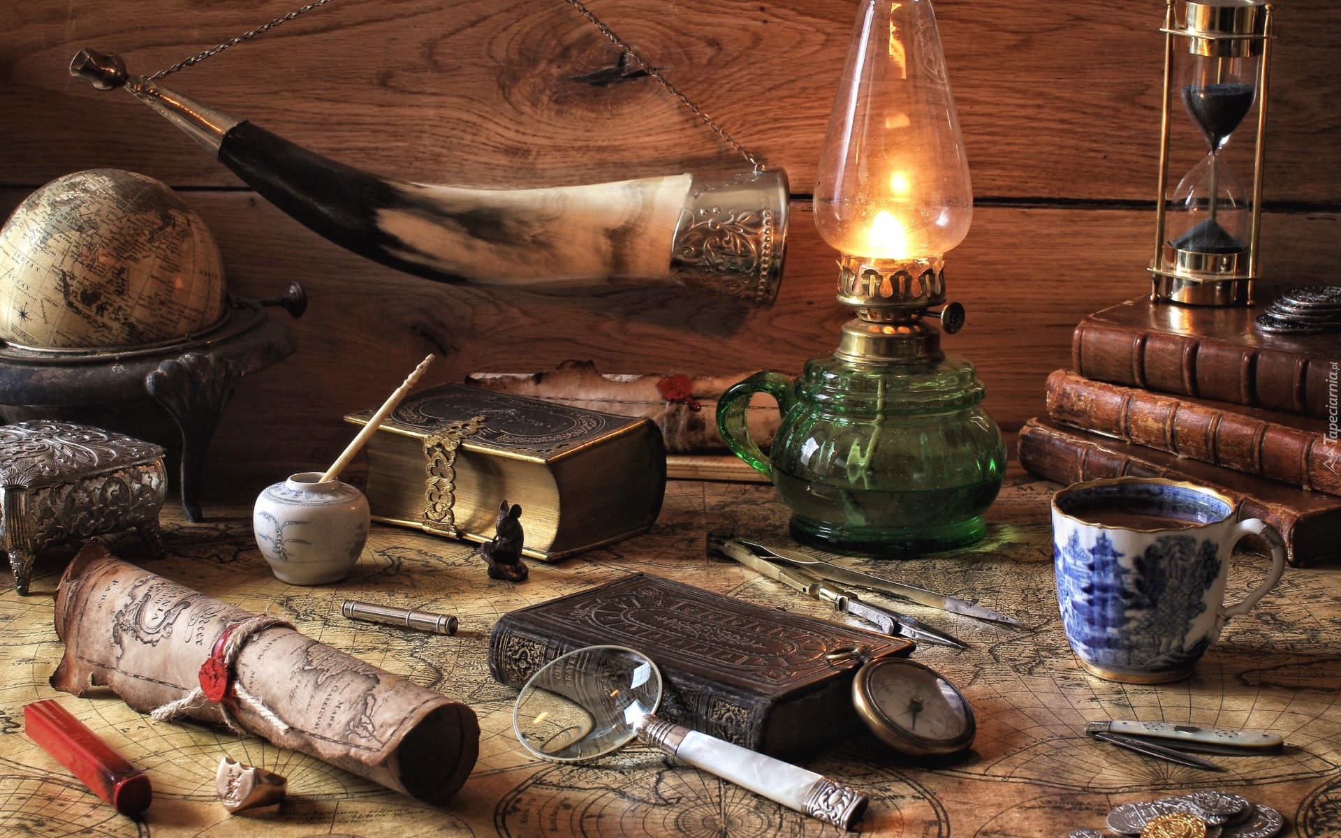 Edytor tapety: Lampa naftowa obok bibelotów na stole