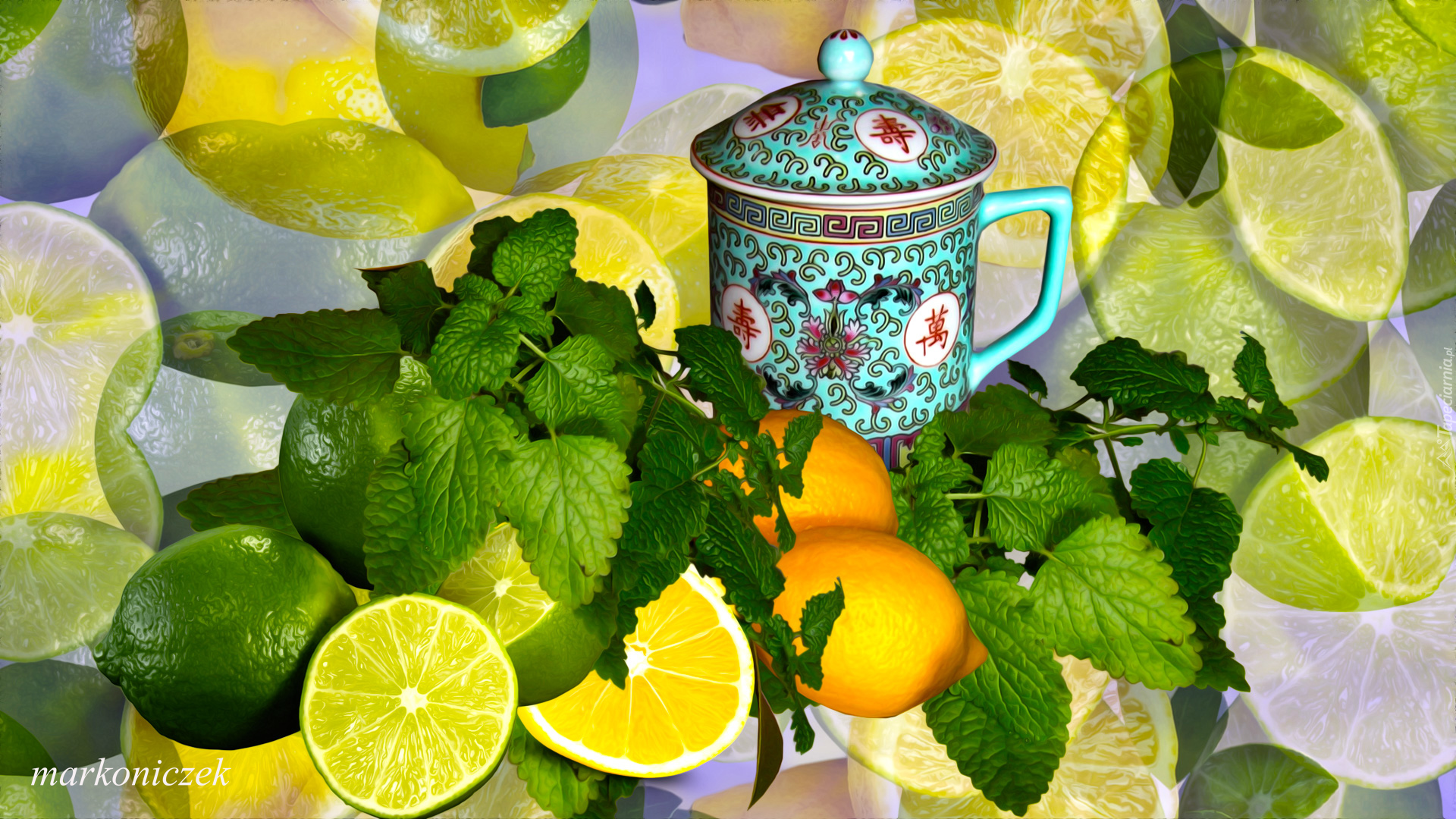 Edytor tapety: Zaparzacz do herbaty obok limonek i cytryn