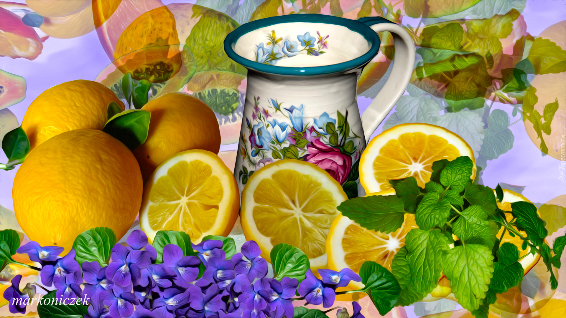 Edytor tapety: Cytryny położone obok kolorowego dzbanuszka