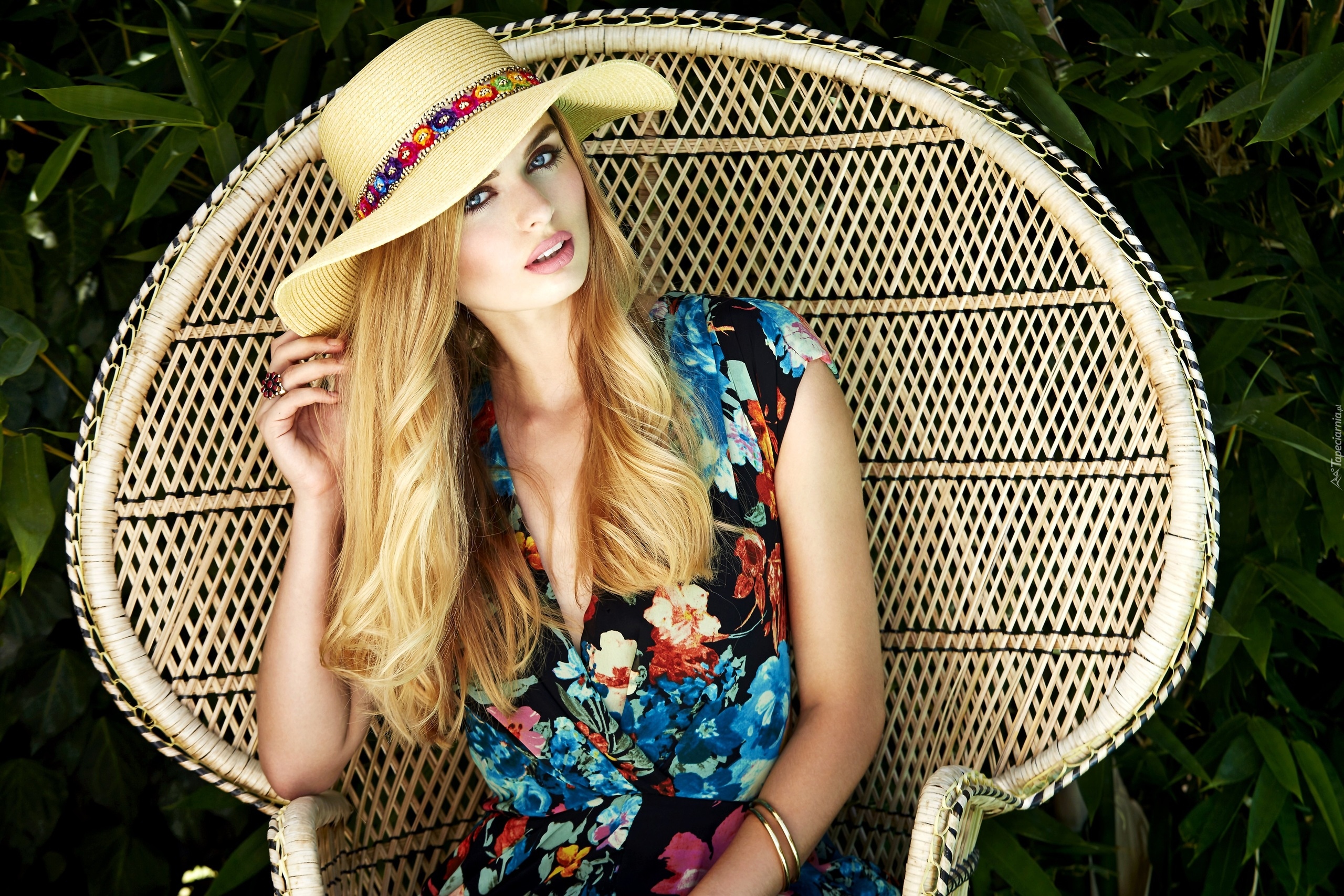 Edytor tapety: Blondynka w kapeluszu na krześle